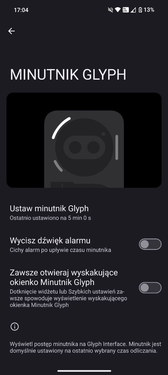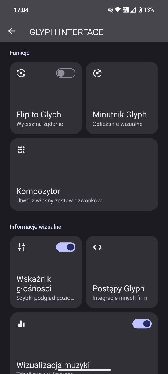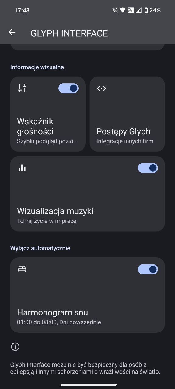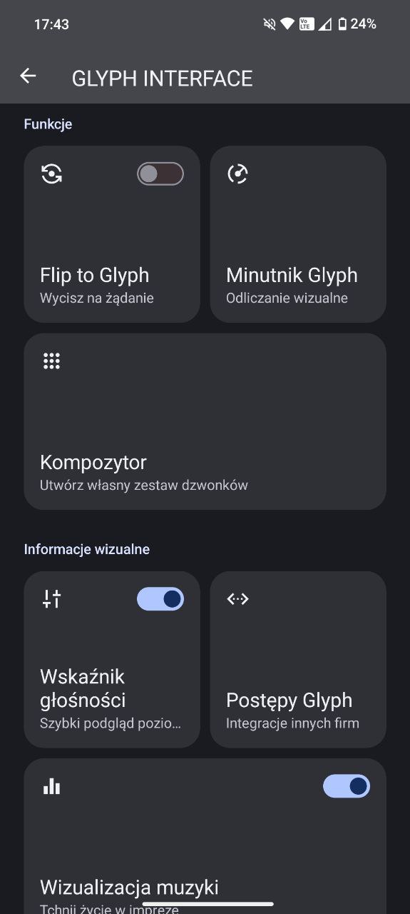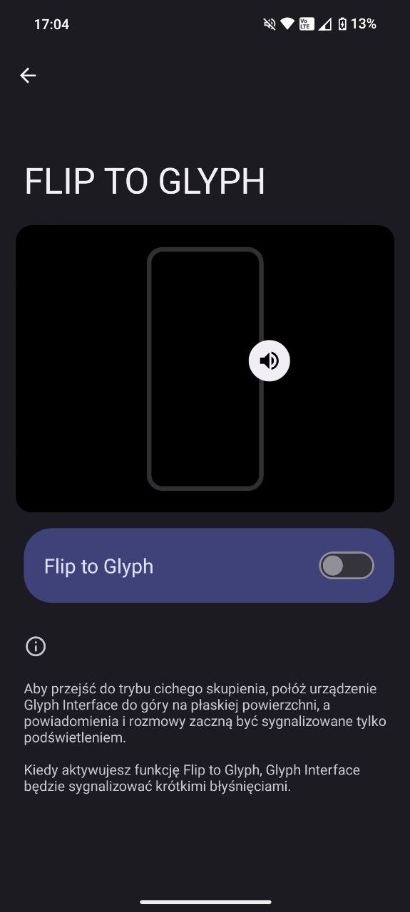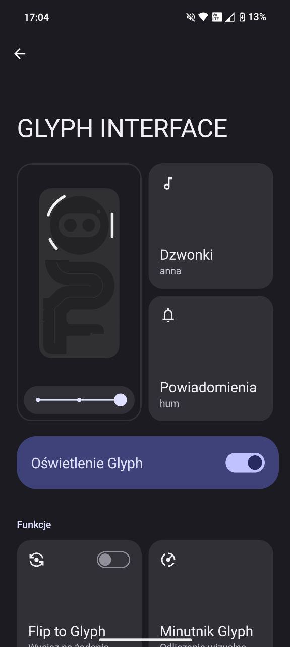 Jednym z najciekawszych i najbardziej przydatnych dodatków jest Flip to Glyph — gdy telefon leży ekranem do dołu, dźwięki są automatycznie wyciszane, a powiadomienia sygnalizowane jedynie przez podświetlenie. Glyph może także pełnić rolę timera, alternatywnej latarki czy subtelnego doświetlenia zdjęć portretowych. Dodatkowo synchronizuje się z muzyką, na przykład ze Spotify, działając podobnie jak żarówki Philips Hue. Możliwość konfiguracji świateł i dźwięków dla powiadomień i połączeń daje sporo opcji personalizacji.