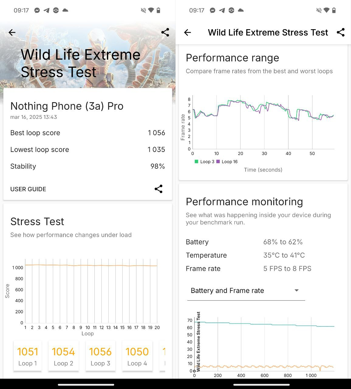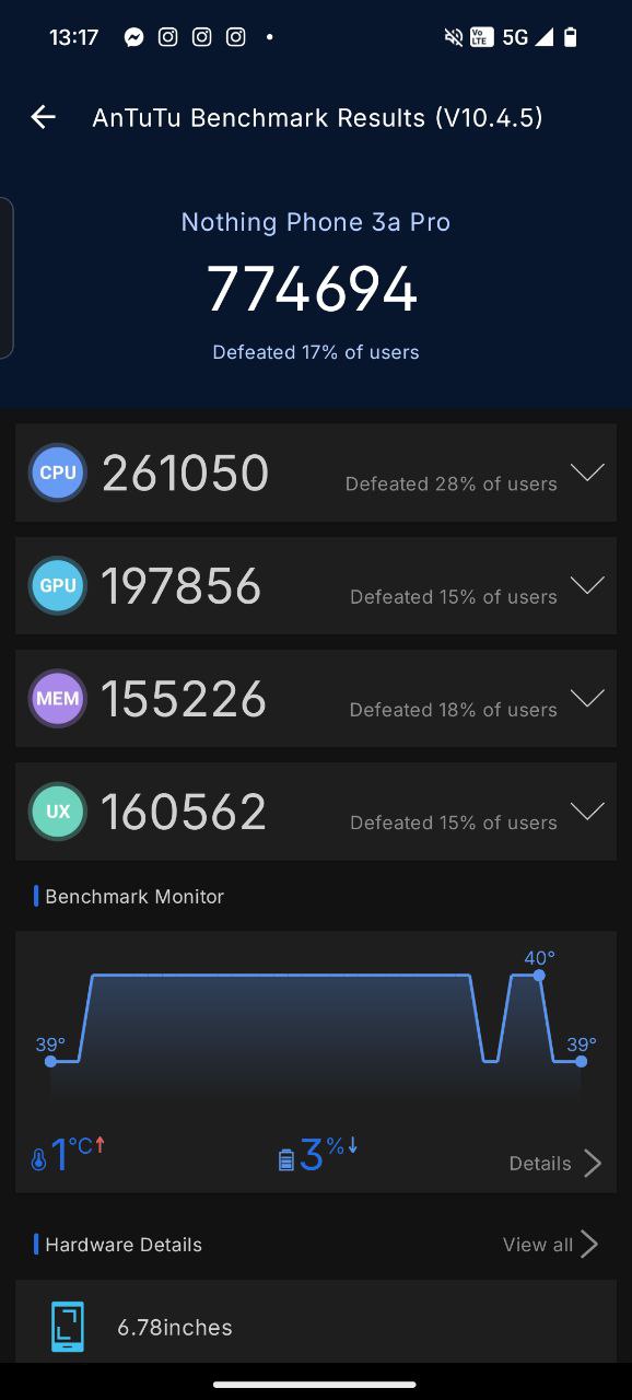 A co jeśli chodzi o baterię? Nothing Phone (3a) Pro oferuje ogniwo o pojemności 5000 mAh, co w teorii daje do dwóch dni pracy, ale w typowym użytkowaniu faktycznie trzyma się nieźle. Zużycie energii spadło o 8% dzięki Snapdragonowi, co według Nothing oznacza dodatkowe 30 minut dziennie. Szybkie ładowanie 50 W ładuje akumulator do 50% w niecałe 20 minut, co jest dobrym wynikiem, choć konkurencja w tej cenie zazwyczaj oferuje więcej — ale warto pamiętać, że są też producenci, którzy za większe pieniądze oferują mniej. Podzespoły są solidne i dają radę, dokładnie tak, jak można było się spodziewać — ale nie ma tu fajerwerków, które wyróżniłyby ten model na tle rywali. Smartfon poradził sobie jednak ze wszystkimi testami benchmarkowymi (co nie udało się ostatnio Xiaomi 15), których wyniki możecie zobaczyć poniżej.