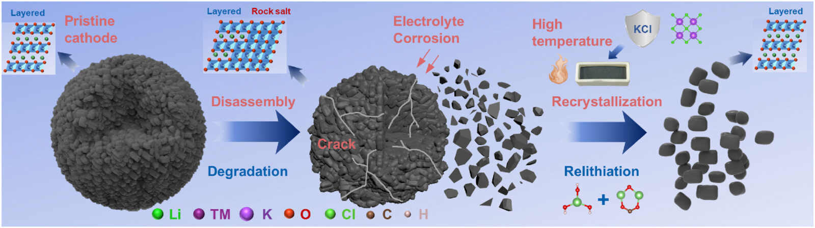 Aby rozwiązać ten problem, zespół badawczy dodał wysokotemperaturowy składnik – chlorek potasu (KCl), który znacząco poprawia wymianę jonów i transport masy w kąpieli solnej. Dzięki temu udało się całkowicie zrekonstruować strukturę katod, nawet tych poważnie zdegradowanych. Skąd w ogóle potrzeba takiej “naprawy”? Ano stąd, że akumulatory litowo-jonowe z czasem tracą wydajność z powodu defektów strukturalnych, utraty aktywnego litu oraz powstawania faz niepożądanych. Dzięki metodzie stopionej soli te uszkodzenia mogą zostać naprawione, a katoda po przejściu całego procesu odzyskuje swoją pierwotną warstwową strukturę, eliminując defekty i zapobiegając dalszej degradacji.