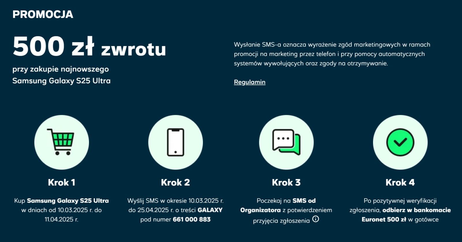 Aby skorzystać z tej wyjątkowej oferty, wystarczy spełnić kilka prostych warunków. Podstawowy – w okresie między 10 marca a 11 kwietnia 2025 roku należy w salonie Plusa lub za pośrednictwem strony internetowej operatora zawrzeć umowę (nową, lub przedłużenie obecnej), wybierając ofertę z Samsungiem Galaxy S25 Ultra. Po zakupie należy wysłać SMS o treści GALAXY na numer 661 000 883, aby potwierdzić swój udział w promocji. Zwrotnie otrzymamy SMS z potwierdzeniem, a po pozytywnej weryfikacji otrzymamy numer transakcji oraz PIN, z którym udajemy się do najbliższego bankomatu Euronet, by odebrać 500 zł zwrotu w gotówce.