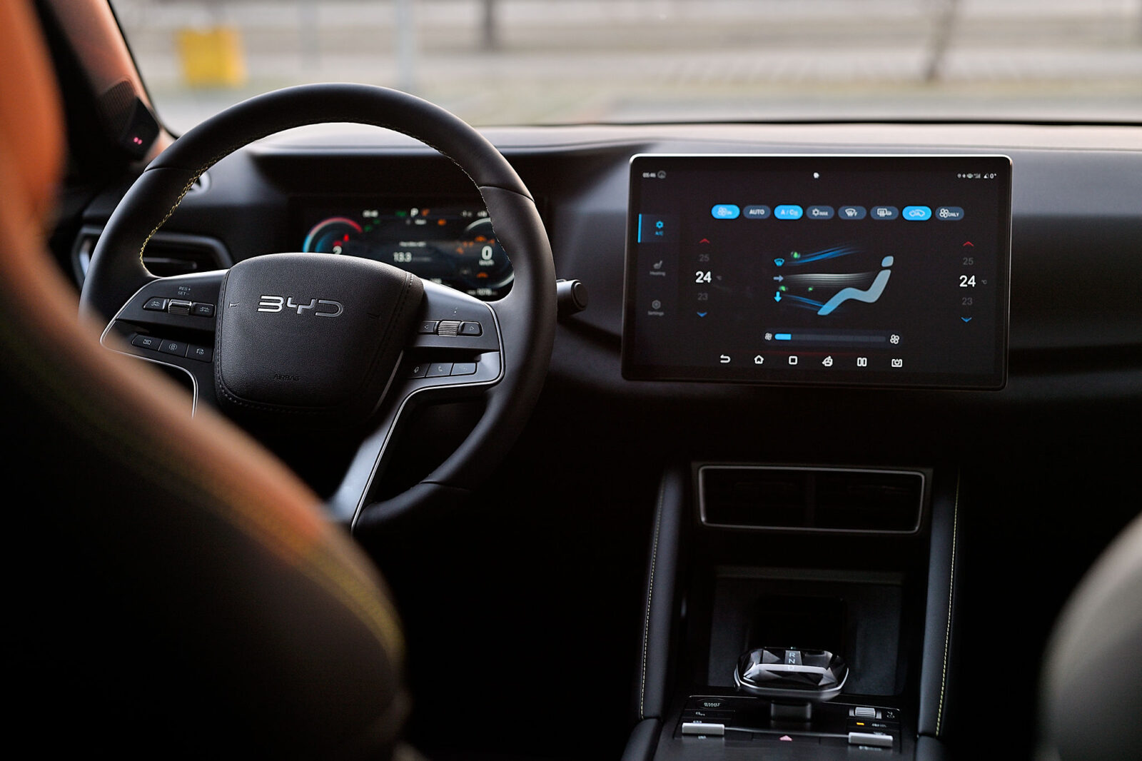 Standardowym wyposażeniem ATTO 2 jest pompa ciepła, a więc wręcz konieczny element każdego elektrycznego samochodu w umiarkowanym klimacie, który rozwiązuje problem zbyt dużej ilości energii poświęcanej na ogrzewanie. Możecie też zapomnieć o zastanawianiu się godzinami nad konfiguracją, ponieważ BYD sprzedaje ATTO 2 w dwóch wersjach wyposażenia, bo Active (129900 zł) oraz Boost (141000 zł), ale już podstawowa wersja Active oferuje bogate wyposażenie, które wyróżnia ją na tle konkurencji.