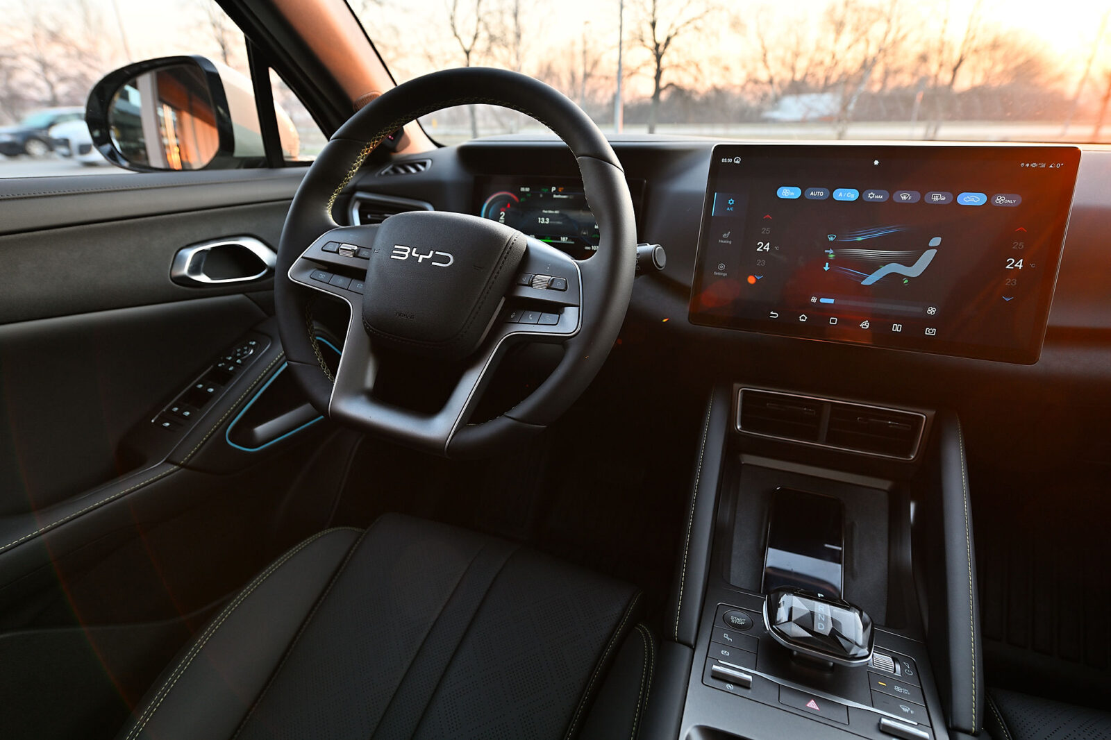 Na wnętrze ATTO 2 nie ma na co narzekać, bo samochód gwarantuje obsługę Android Auto oraz Apple CarPlay (bezprzewodowo), cyfrowe zegary o przekątnej 8,8 cala, a także wsparcie funkcji głosowych, które to są aktywowane komendą Hi BYD. Samochód posiada również funkcję karaoke zintegrowaną z systemem infotainment, kilka portów USB z 60-watowym USB-C na czele oraz opcję ładowania bezprzewodowego w droższym wariancie. Bezpieczeństwo ma z kolei zapewniać kompleksowy zestaw systemów asystujących kierowcę, a w tym adaptacyjny tempomat, systemy ostrzegania o kolizjach, asystenta pasa ruchu oraz monitoring martwego pola.