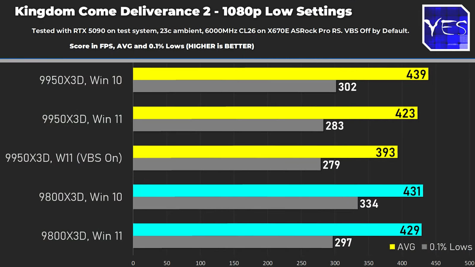 Jak pokazały testy przeprowadzone przez kanał YT “Tech YES City”, zalecane przez Microsoft ustawienie wcale nie było optymalne do grania. Na przykład w Fortnite istnieje 18% przewaga wydajnościowa w systemie Windows 10 w porównaniu z systemem Windows 11 (VBS). Co być może jeszcze ciekawsze, Windows 10 nadal ma przewagę, nawet gdy w Windows 11 wyłączono VBS. Choć różnica się zmniejszyła, to nadal wynosiła znaczące ok. 9,25% na korzyść Windows 10. Podobną tendencję można było zaobserwować także w Kingdom Come Deliverance 2 i innych grach, choć nie w takim stopniu, jak w Fortnite .