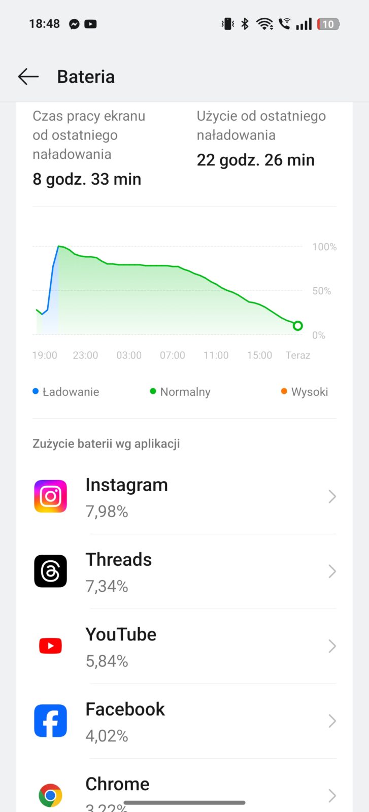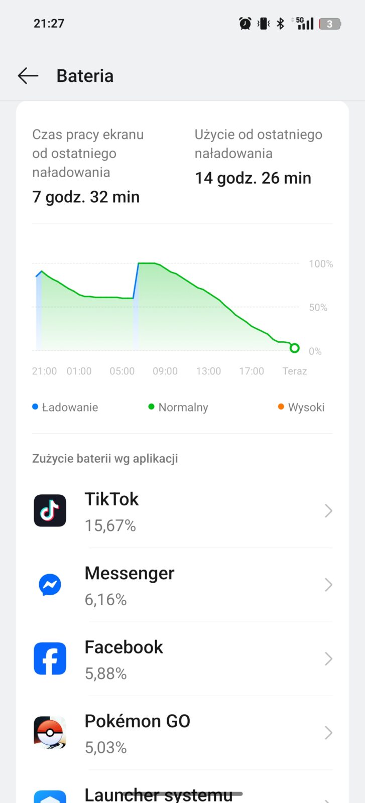 Dzięki akumulatorom z wypełnieniem krzemowo-węglowym w cieńszych obudowach udaje się zmieścić dużo większe pojemności baterii. W przypadku Oppo Reno 13 Pro 5G zamiast 5000 mAh z poprzednika otrzymujemy 5800 mAh. Czy przekłada się to na czasy pracy lepsze o 18%? Niekoniecznie. Smartfon dość szybko traci energię przy zadaniach wymagających pobierania treści z sieci, więc maniacy mediów społecznościowych wysiedzą z nim pełny dzień. Na więcej będą mogli pozwolić sobie inni i dla nich telefon Oppo będzie wystarczył na nawet dwa dni pracy w trybie 60 Hz i półtora w trybie 120 Hz. To wszystko przekłada się na czasy pracy od 5 do nawet 8,5 godziny.