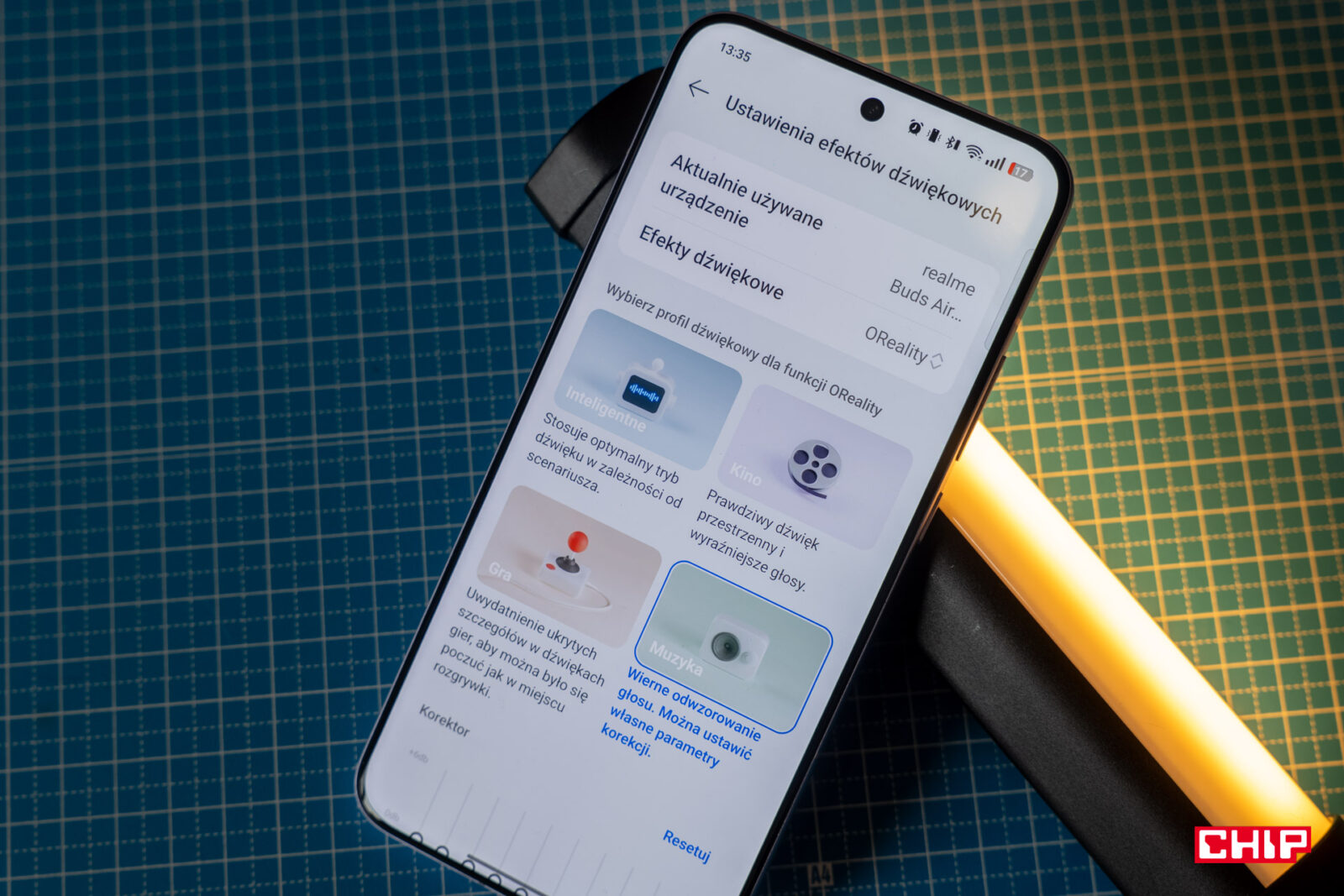 System głośników stereo z jednym z nich ukrytym na dolnej części obudowy i drugim znajdującym się tuż nad ekranem to standard, do którego producenci przyzwyczajali nas od lat. W tej formie Oppo Reno 13 Pro 5G podaje nam dźwięk, a ten doprawiają funkcje OReality dopasowujące go do odtwarzanej treści. W ramach ustawienia słuchania muzyki skorzystamy z korektora graficznego, jednak ten działa tylko przy korzystaniu ze słuchawek. Jeśli jednak nie interesuje nas kodowanie tego rozwiązania, możemy po prostu wybrać opcję inteligentnego dobierania dźwięku do scenariusza.