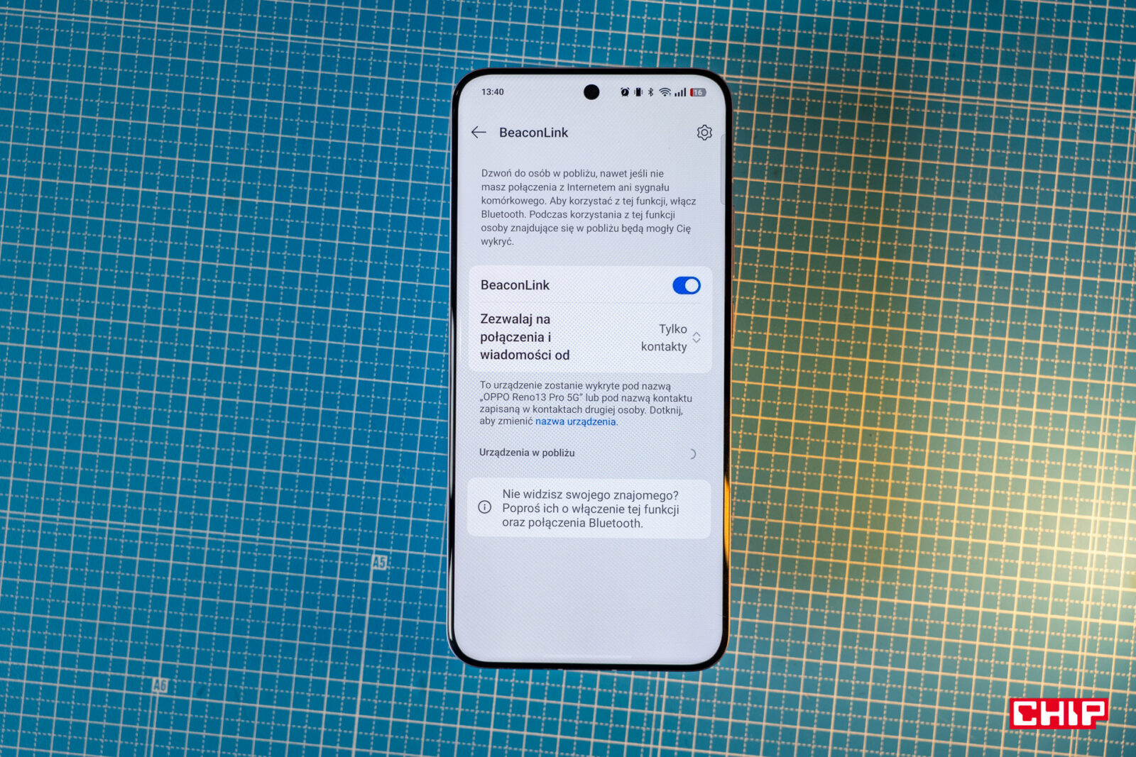Wzorem wielu urządzeń, tu nie mogę napisać o Oppo Reno 13 Pro 5G złego słowa. Smartfon korzysta z łączności Wi-Fi 6E i choć nie mam w tej chwili odpowiedniego routera do sprawdzenia prędkości, tak zasięg mnie zadowala. Podobnie rzecz ma się z jakością rozmów, która była znakomita po obydwu stronach. Problemów nie miałem także z Bluetooth 5.4, który w smartfonach Oppo umożliwia skorzystanie z BeaconLink – systemu rozmów telefonicznych i wiadomości bez użycia sieci komórkowej. Do jego wykorzystania potrzebujecie zalogowania na konto Oppo, a połączenia wykonacie w odległości od 10 do 200 metrów w oparciu o Bluetooth.