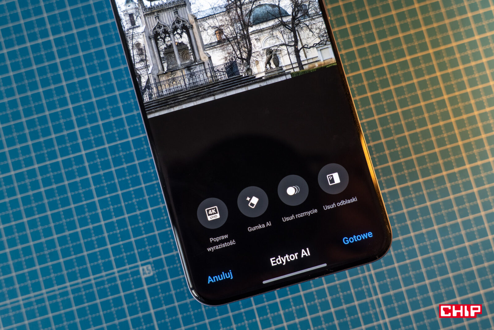 Na ten moment większość uwagi skupiać będą zatem rozwiązania oparte o edycję zdjęć łączące się z serwerem. W galerii znajdziemy cztery opcje. Jedna z nich ma podbijać jakość zdjęć i jeśli faktycznie mamy zdjęcie przeciętnej jakości i niskiej rozdzielczości, to coś więcej możemy z nim osiągnąć. Dobrze działa też usuwanie odbić. W sposób naturalny, bez uszkadzania struktury zdjęcia, sztuczna inteligencja potrafi zmienić rozbłysk światła w jego brak. Nie zawsze się to uda – czasem po prostu rzeczy zza szkła nie przebijają się na tyle w kadrze.