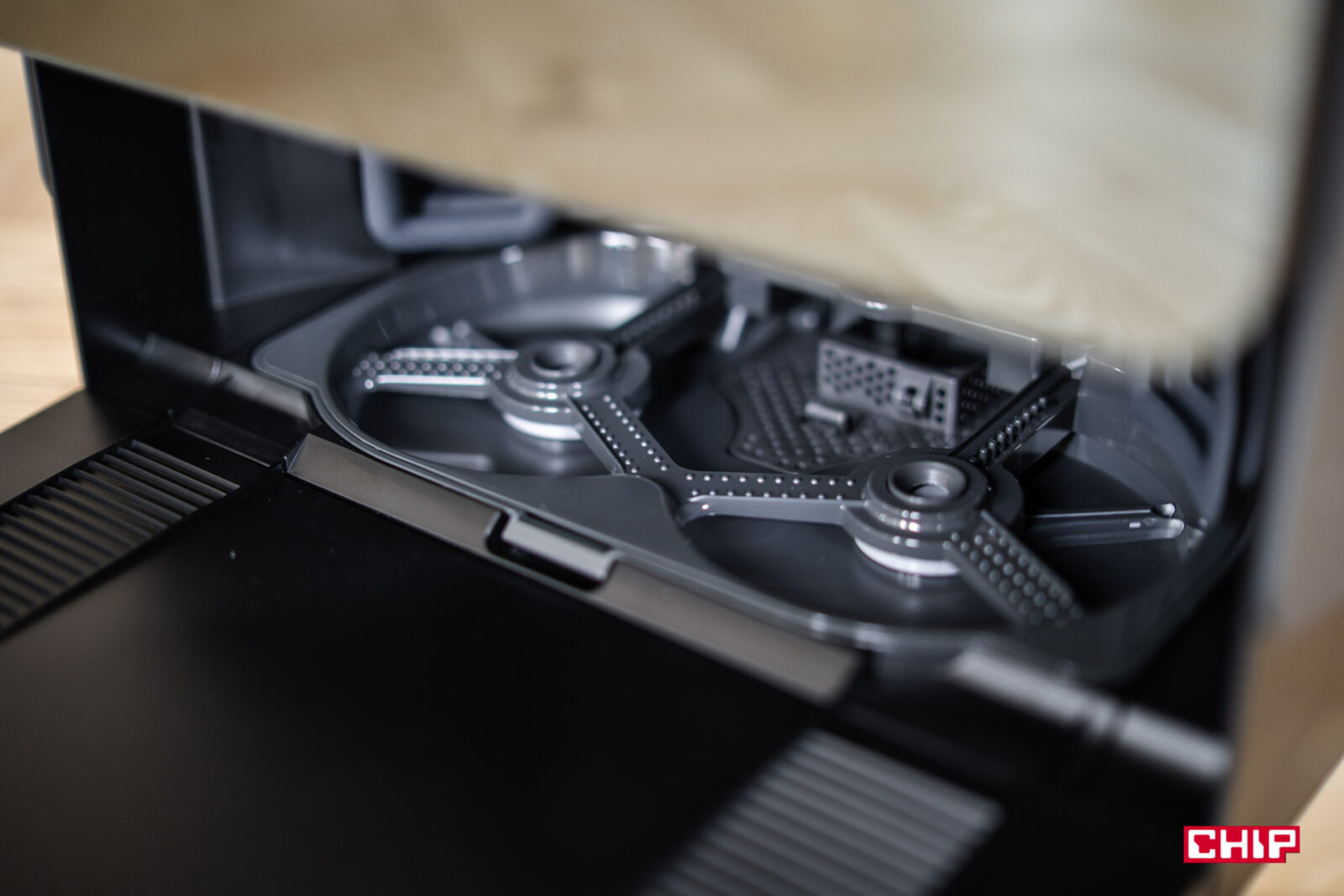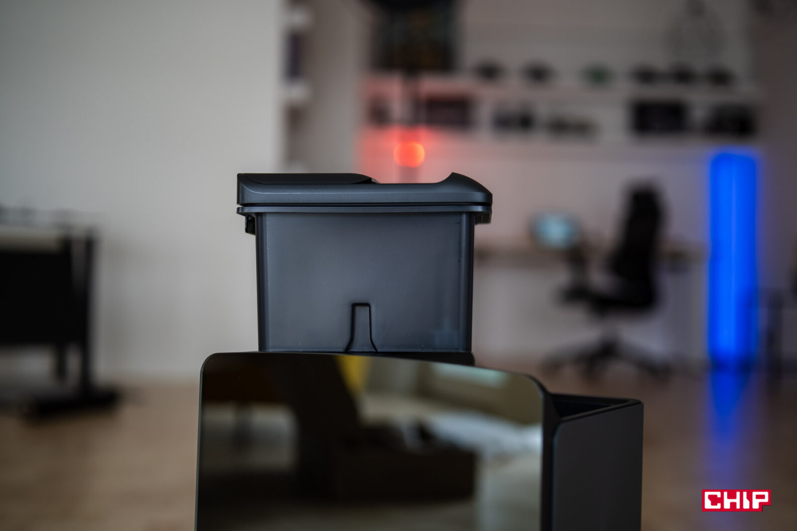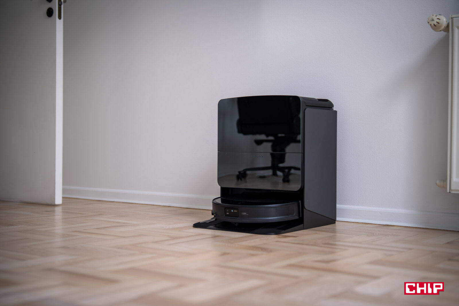 Po skończeniu sprzątania robot udaje się do stacji dokującej, gdzie opróżnia pojemnik na zabrudzenia oraz płucze (w temperaturze 80 stopni Celsjusza), a następnie suszy (w temperaturze 55 stopni Celsjusza) podkładki mopujące. Dzięki czemu nie musimy ich prać ręcznie, wszystko dzieje się bez naszej ingerencji. Musimy tylko dolewać wodę do pojemnika na wodę czystą, opróżniać pojemnik z wodą brudną oraz ewentualnie dolewać detergentu, ale ten jest bardzo wydajny i starcza na długi czas. Wielki plus za to, że pojemniki na wodę są niewysokie, bo w przypadku niektórych robotów jest problem ze zmieszczeniem ich pod kran, jeśli mamy niżej zamontowany. W przypadku Roborocka Saros 10R pojemniki na wodę powinny wejść pod niemal każdy kran.