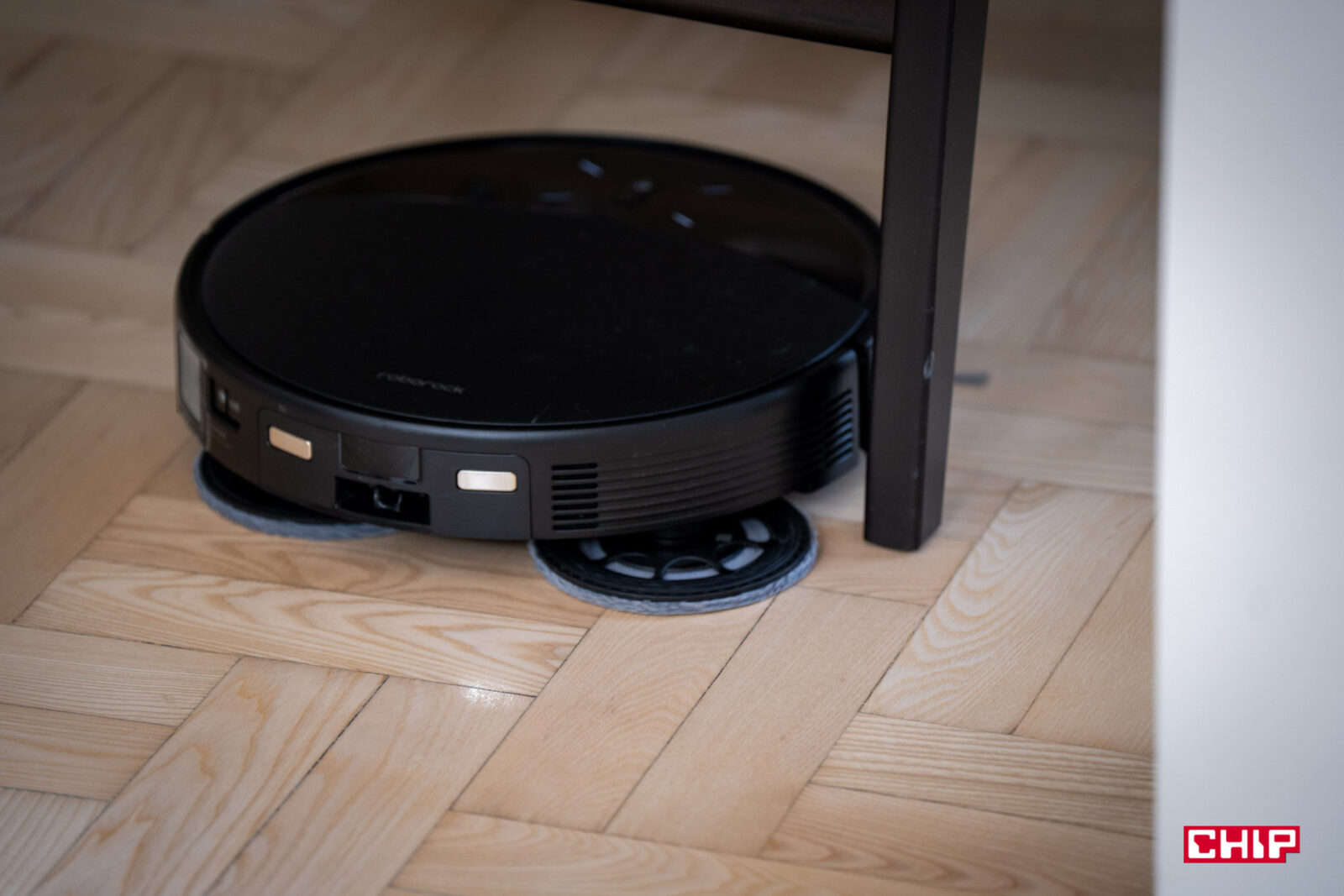 W przypadku wysuwania podkładki mopującej, jak widzicie na zdjęciach, pozwala to sięgnąć nią poza obrys obudowy robota i to też pozwala na skuteczniejsze czyszczenie wzdłuż krawędzi, ale też jak wspominałem wcześniej, również dookoła nóg mebli.