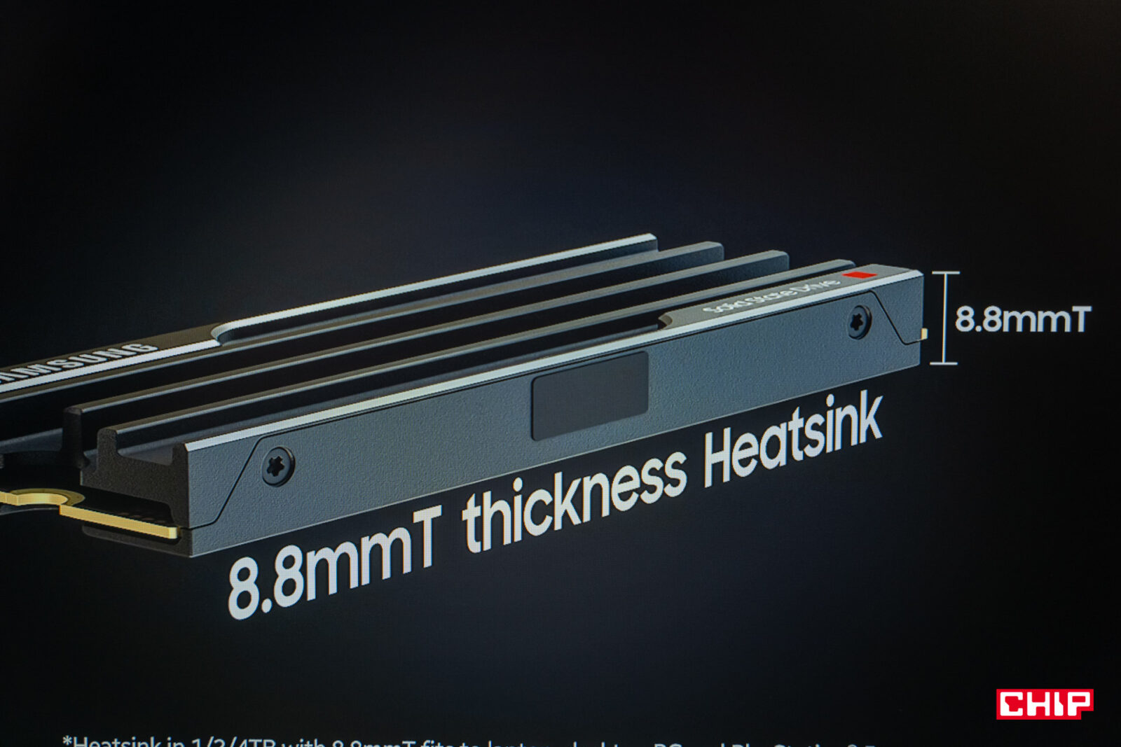Efektywność energetyczna to także radzenie sobie z ciepłem. Samsung stworzył dysk o grubości mniejszej niż 8mm, a więc taki, który mógłby znaleźć swoje zastosowanie między innymi w kieszeniach laptopów gamingowych. Samsung 9100 Pro z radiatorem będzie mógł szczycić się tym, że w tej wersji zmieści się do kieszonki stworzonej w konsoli PlayStation 5 i to także w wersji 8TB. Taki rezultat udało się osiągnąć między innymi dzięki nowemu, 5-nanometrowemu kontrolerowi pokrytemu niklem oraz dużej blaszce odprowadzającej ciepło.