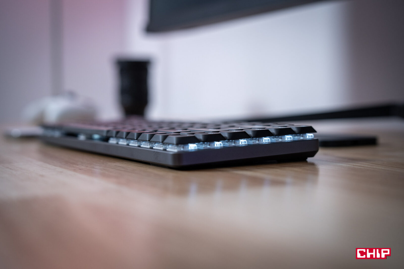 Klawiatura prezentuje się bardzo efektownie, a przy tym jest do bólu elegancka. To faktycznie może być ozdoba biurka, czego dopełnieniem jest minimalistyczne, białe podświetlenie. Nie mamy możliwości zmiany jego koloru, tylko jasność oraz typ animacji. Te są iście gamingowe, bo mamy tu różne rodzaje fale, rozbłyski, animacje działające samodzielnie lub po wciśnięciu przycisku… Dosłownie gaming pełną gębą, tylko bez RGB. Jest tu jeden kolorowy akcent i jest to spacja, która świeci się na niebieski w trakcie ładowania lub czerwono, kiedy akumulator jest bliski rozładowania.
