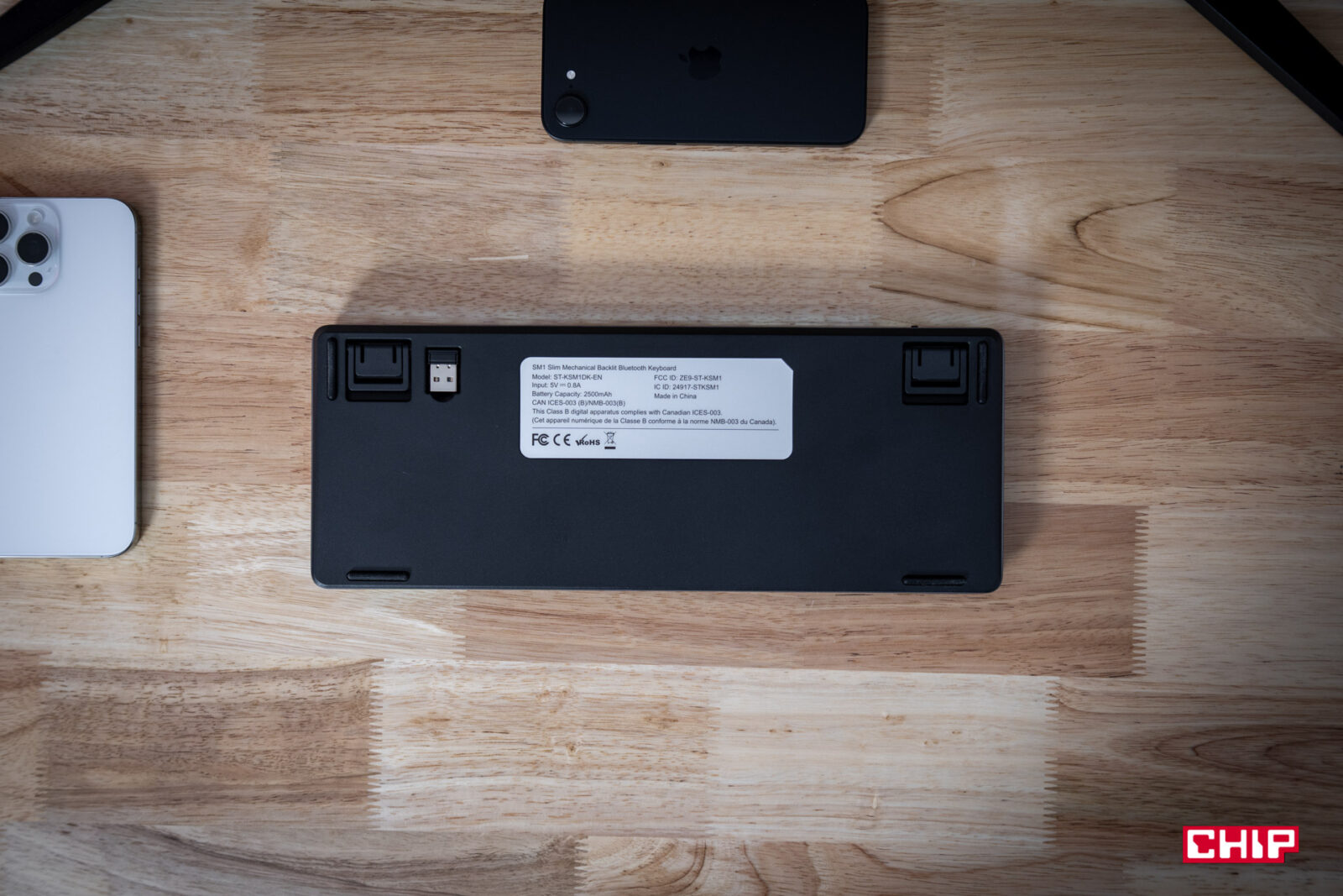 Satechi SM1 może być podłączona do czterech urządzeń jednocześnie. Do dwóch za pomocą Bluetooth, do jednego przez odbiornik USB oraz jednego przewodowo. Odbiornik znajduje się na spodzie klawiatury, gdzie solidnie trzyma go magnes. Pomiędzy urządzeniami przełączamy się za pomocą skróty FN + 1-4. Również prostym skrótem zmieniamy układ klawiszy z Mac OS na Windowsa i do tego służy skrót FN + O/P. Jak już wspominałem, w zestawie znajdują się dwa komplety klawiszy funkcyjnych, wiec możemy zamienić CMD na ALT-a lub odwrotnie. W zestawie mamy też solidny kable USB.