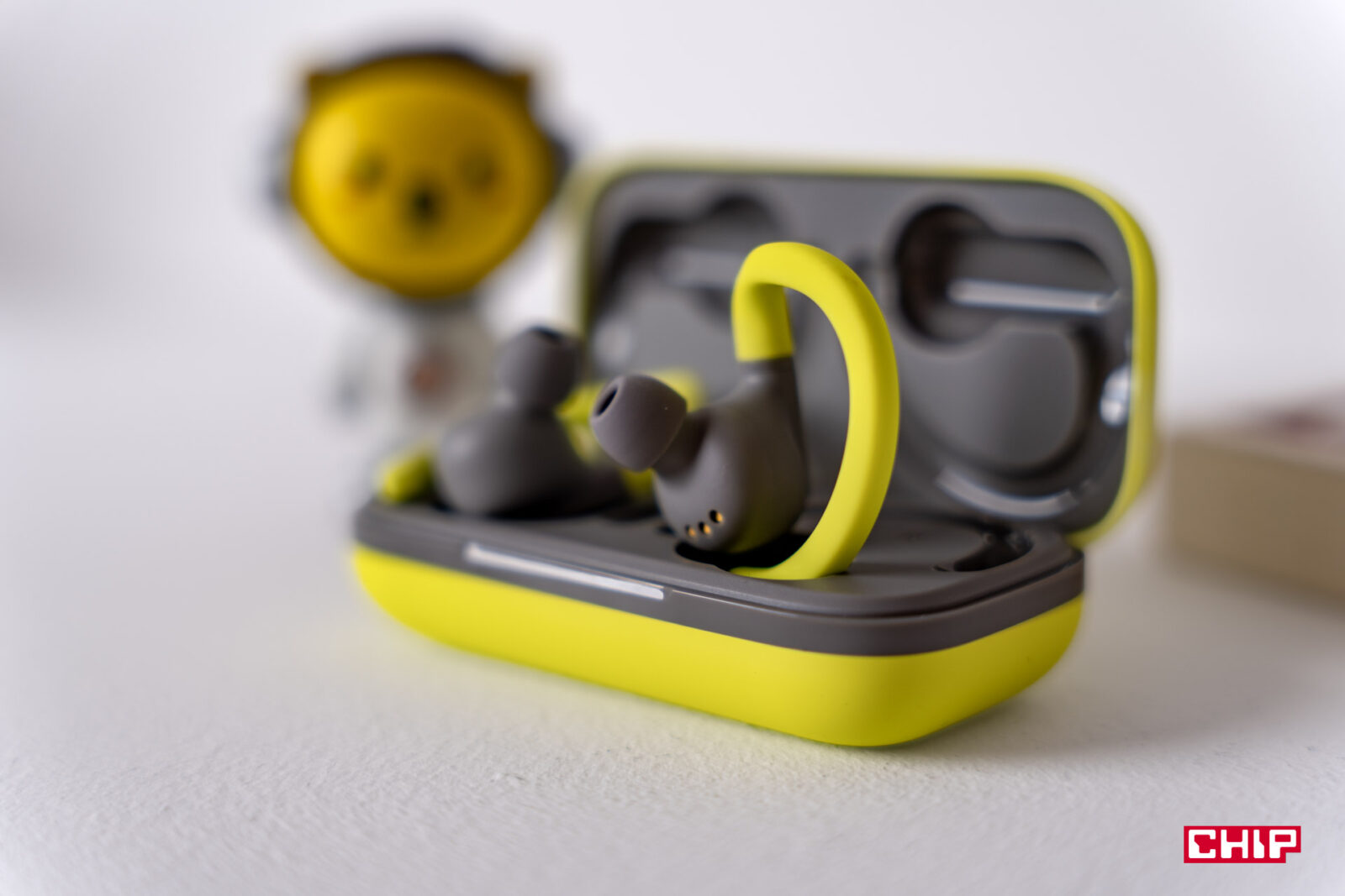 Samym słuchawkom też nie można nic zarzucić pod względem wykonania. Cześć grająca jest wykonana z twardego i solidnego tworzywa sztucznego, a część zaczepna to elastyczny materiał. Jest miękki, bardzo łatwo się wygina i dopasowuje do kształtu ucha. Dzięki temu ze słuchawek korzysta się bardzo wygodnie. Leżą dobrze nawet w małym uchu, a gumowa część solidnie trzyma się podczas uprawiania sportu. Konstrukcja jest odporna na wilgoć, więc pot nie jest jej straszny.