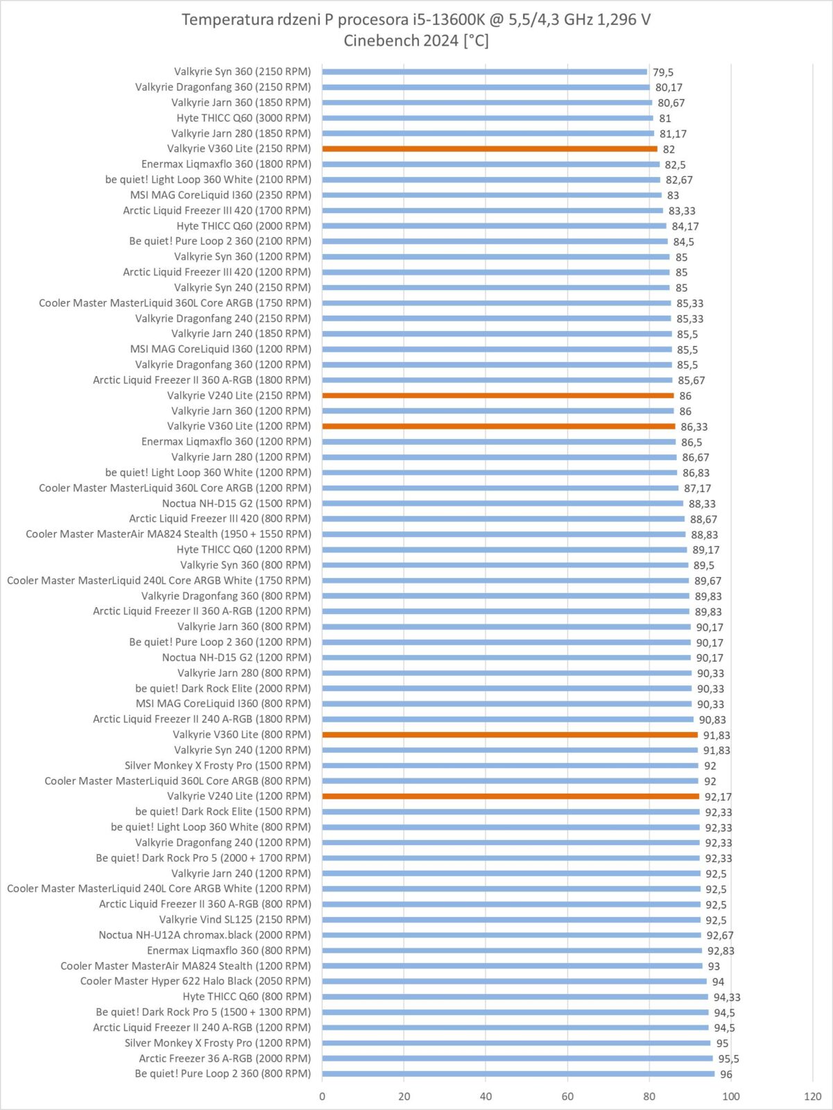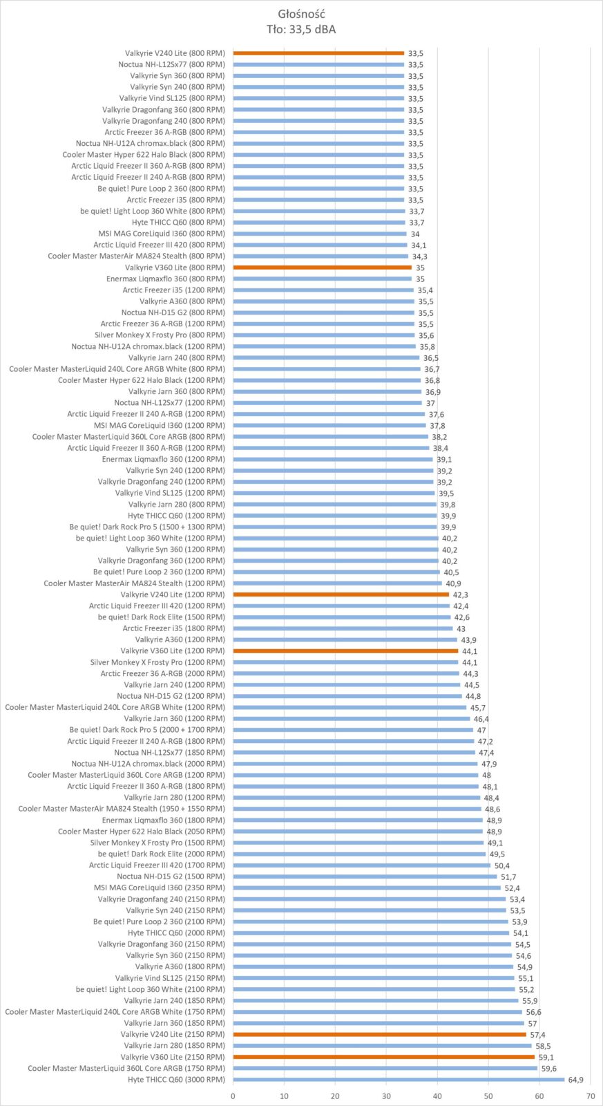 Pod względem wydajności jest dobrze. W szczególności wersja 240 wypada świetnie i jest jedną z najwydajniejszych na wykresach. Model 360 trochę odstaje od innych konstrukcji Valkyrie, ale nadal oferuje bardzo dobrą wydajność na wszystkich obrotach. Natomiast wentylatory są głośne. Na maksymalnych obrotach jest bardzo głośno, na 1200 RPM już lepiej, ale mogło by być bliżej 40 dBA w przypadku obu wersji. 800 RPM to już cicha praca obu chłodzeń, o ile również obniżycie RPM pompki. Ta jest bowiem też głośna na maksymalnych obrotach. Widać to również po testach normalizacji, gdzie nadal jest dobrze, ale widać różnice do najlepiej wypadających konstrukcji.
