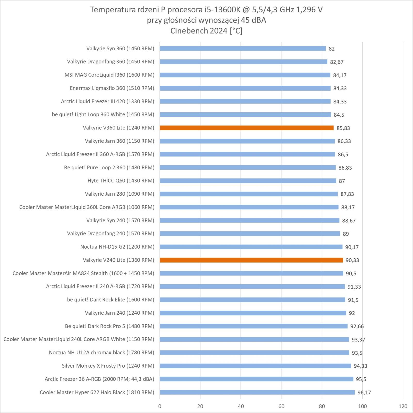 Przy normalizacji do 45 dBA wersja V240 Lite notuje dobre wyniki, choć też widać małą różnicę w stosunku do choćby Dragonfanga 240. W przypadku 360 zajmuje ona ponownie 7 miejsce – wyprzedza Jarna, Liquid Freezera II czy Pure Loop 2 wszystkie w wersji 360.