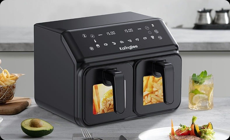 Dwukomorowa frytkownica beztłuszczowa ma dwa kosze, każdy po 4 litry pojemności. Komory są niezależne – osobno ustawia się dla każdej czas i temperaturę pracy. Wbudowane okienka pozwalają na wizualną kontrolę przygotowywanych potraw.