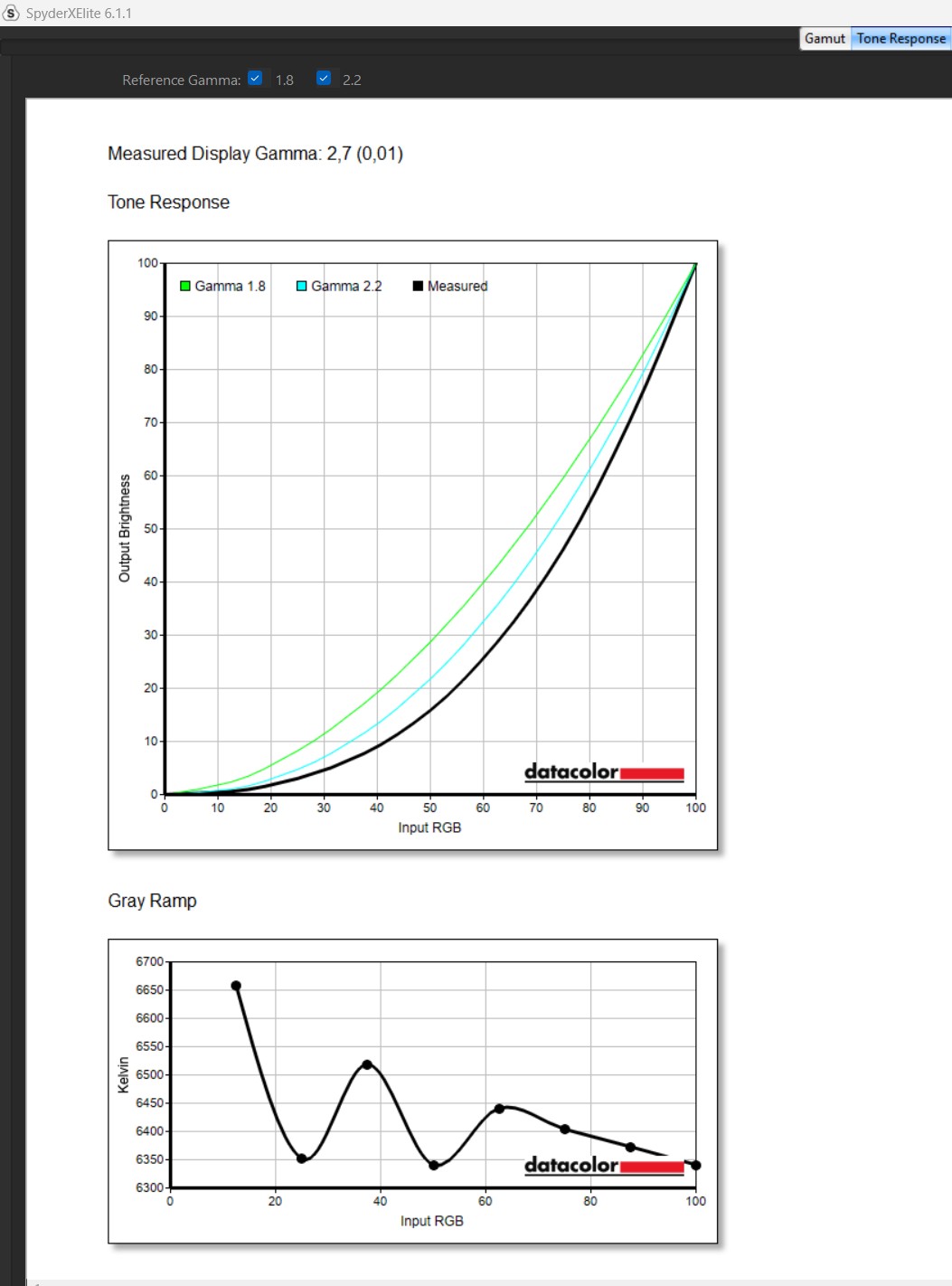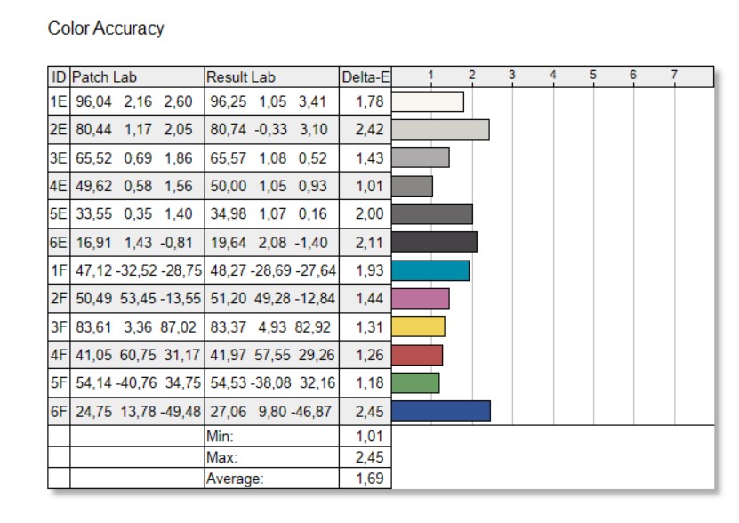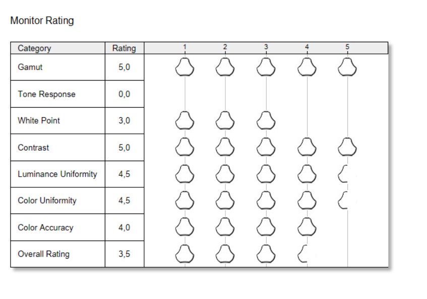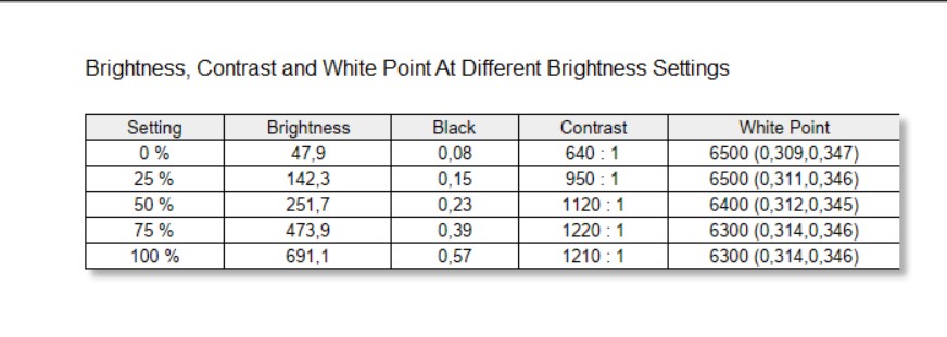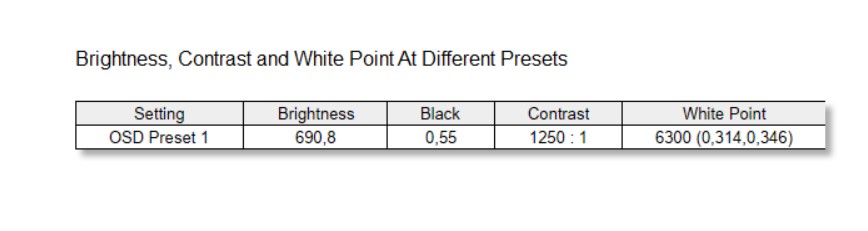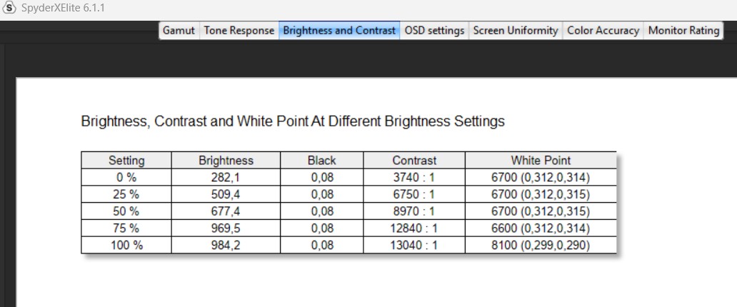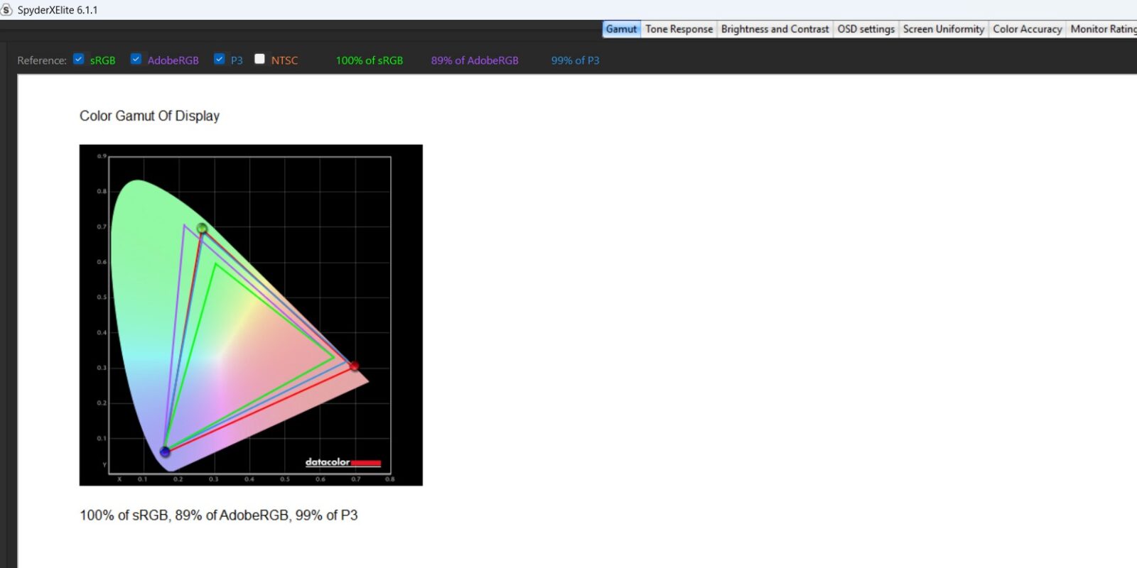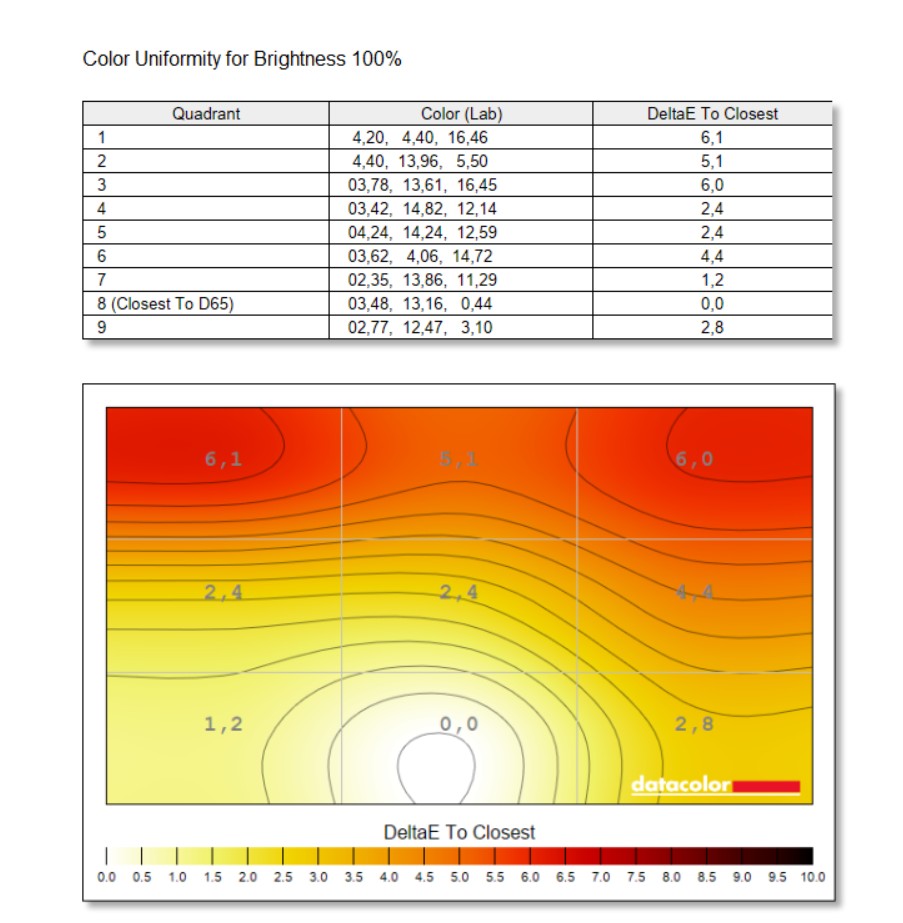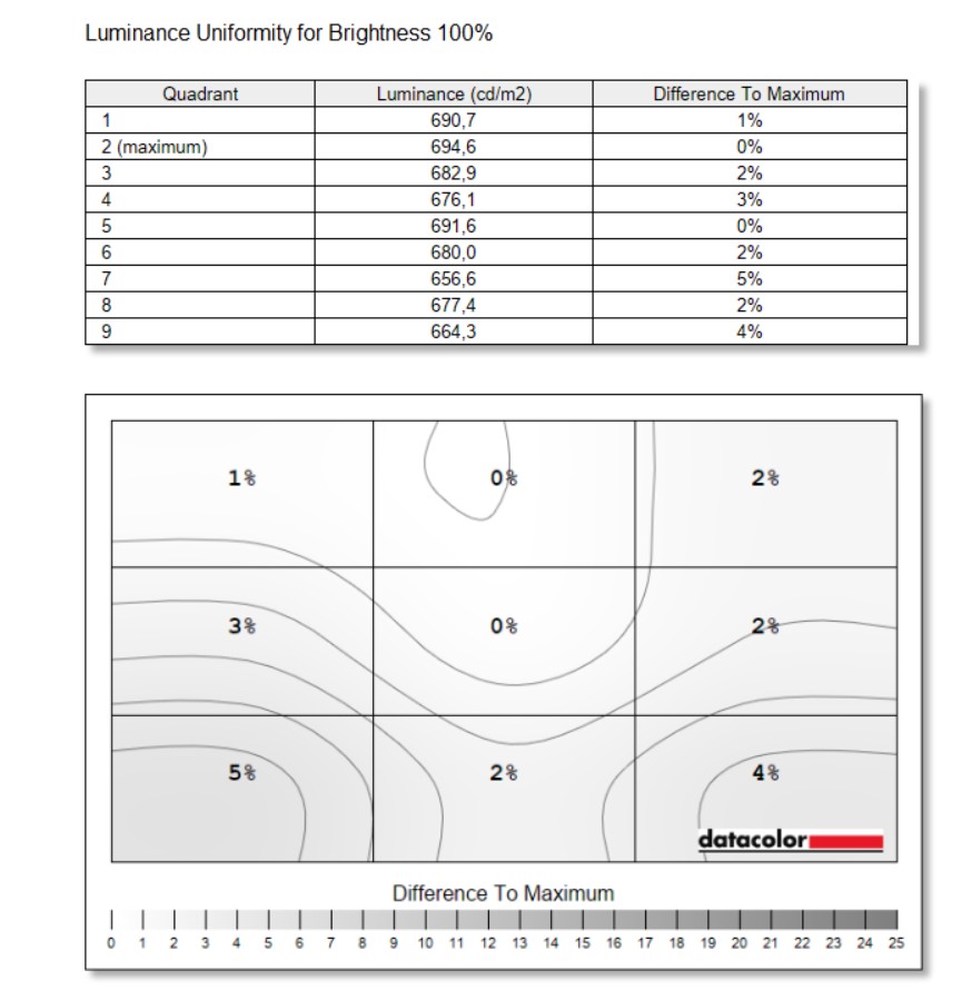 Te pomiary wykonane w trybie jednolitego podświetlenia na ustawieniu DCI-P3 oraz domyślnym trybie mówią nam, że ekran wypada bardzo dobrze w większości kategorii oceny jakości wyświetlania. Pokrycie przestrzeni barw wynosi 100% sRGB, 89% AdobeRGB i 99% DCI-P3, co gwarantuje szeroką gamę kolorów – idealną do pracy z grafiką czy wideo. Kontrast na poziomie do 1250:1 oraz jasność przekraczająca 690 nitów zapewniają doskonałą czytelność w jasnym otoczeniu. Równomierność luminancji oraz jednorodność kolorów uzyskały wysokie oceny (po 4,5/5), z minimalnymi różnicami jasności (do 5%) i niewielkimi odchyleniami ΔE – średnia wynosi jedynie 1,69, co świadczy o bardzo dobrej precyzji odwzorowania barw. Największym mankamentem jest niepoprawna odpowiedź tonalna – zmierzona gamma wynosi aż 2,7 zamiast referencyjnych 2,2, co skutkuje przesadnym przyciemnieniem średnich tonów i otrzymało ocenę 0,0. Punkt bieli również odbiega od wzorca, zwłaszcza przy niższych poziomach jasności, choć przy wyższych ustawieniach stabilizuje się wokół wartości 6300 K.