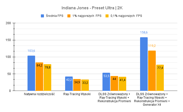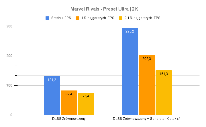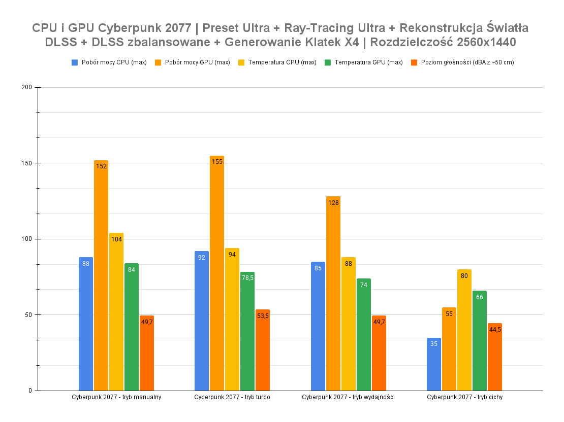 Liczba klatek na sekundę między domyślnym trybem manualnym i turbo utrzymuje się na poziomie błędu pomiarowego, choć ten manualny odznacza się znacznie mniejszym poziomem hałasu przez mniej agresywne krzywe wentylatorów. Tryb wydajności wypada już zauważalnie gorzej w kwestii wydajności, ale za to pozwala zaoszczędzić ponad 30 watów pożeranych przez procesor centralny i graficzny, co widać też po stronie osiąganych temperatur. W trybie cichym sumaryczny pobór spada z 213 watów do ledwie 90 watów, ale pozwala ciągle na zabawę w ponad 60 klatkach na sekundę i nie powoduje znaczącego spadku 0,1% najgorszych klatek, choć spadek średniej z 224 do 108 jest już naturalnie bardzo odczuwalny. Tak z kolei ASUS ROG Strix SCAR 18 (2025) G835 wypada w innych grach na trybie Turbo: