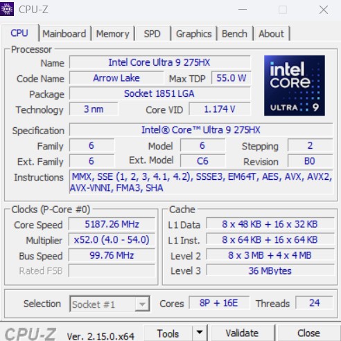 Podczas gdy GeForce RTX 5090 oferuje dostęp do wyprodukowanego w 5-nm technologii GPU o wielkości 378 mm kwadratowych z 45,6 milionami tranzystorów 10496 jednostkami cieniującymi, 328 TMU, 112 ROP, 328 rdzeniami Tensor piątej generacji i 82 rdzeniami RT generacji czwartej, Intel Core Ultra 9 275HX to również sprzęt z najwyższej półki. Nowa architektura Arrow Lake-HX, 3-nm proces TSMC, 17800 mln tranzystorów, solidne iGPU Arc Xe-LPG z 64 EU, 8 rdzeni Performance, 16 rdzeni Efficiency, 24 wątki oraz taktowanie do 5,4 GHz, to połączenie, na które po prostu nie da się narzekać. Przynajmniej na papierze, dlatego od razu przejdźmy do wyników w tradycyjnych benchmarkach.