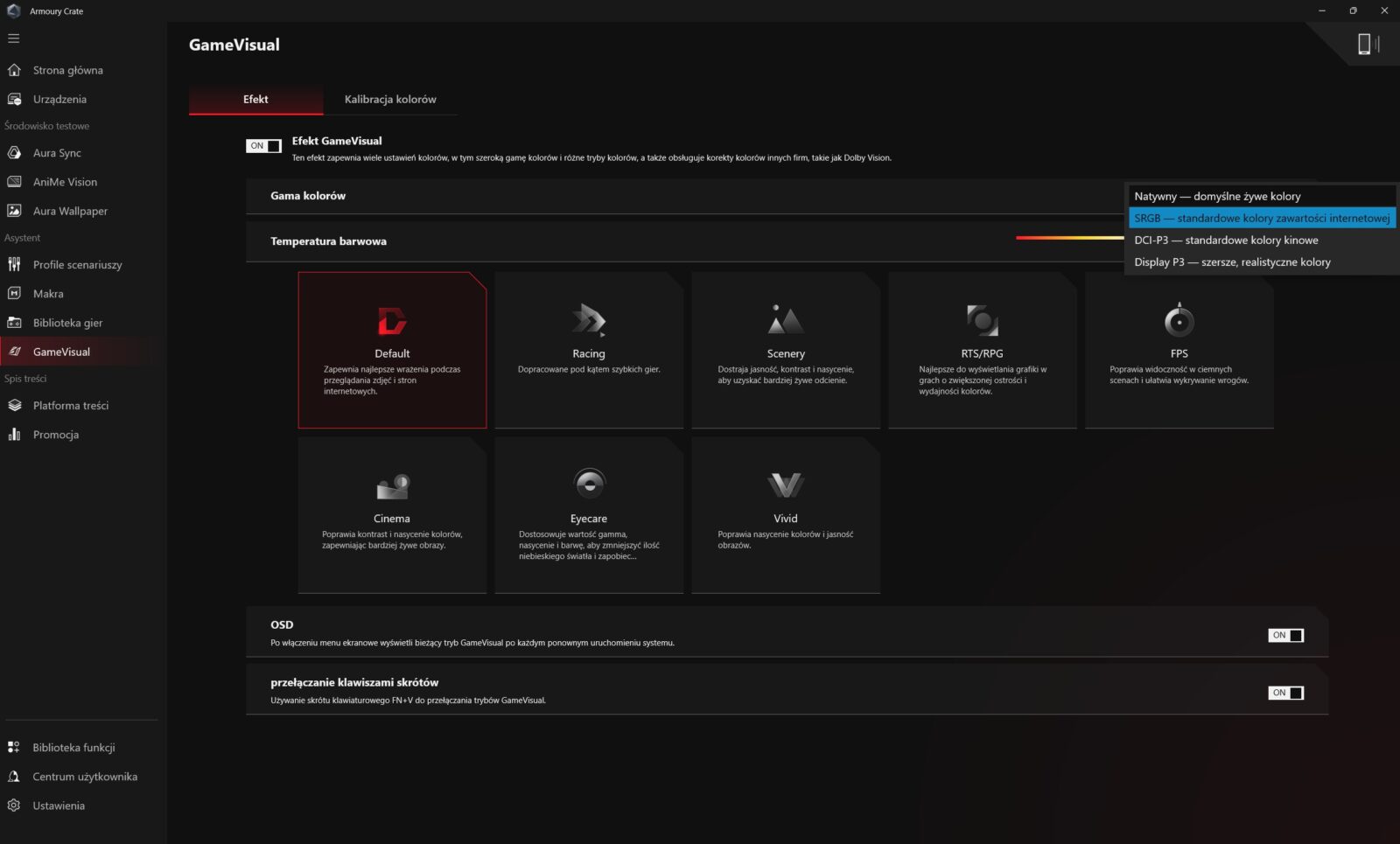 Jak więc sprawdza się to w praktyce? To mówi nam już sam test kolorymetrem na aktywnym GameVisual z przestrzenią DCI-P3 i ustawieniu domyślnym. ASUS zapewnia nam swobodny dostęp zarówno do konkretnych przestrzeni barw (sRGB, DCI-P3 oraz Display P3), jak i kalibracji z myślą o konkretnych grach czy aktywnościach. W skrócie? Dla każdego znajdzie się coś dobrego, ale to jakością DCI-P3 chwali się producent, więc na niej się skupimy. Dowolności wyboru jednak wam nie zabraknie.