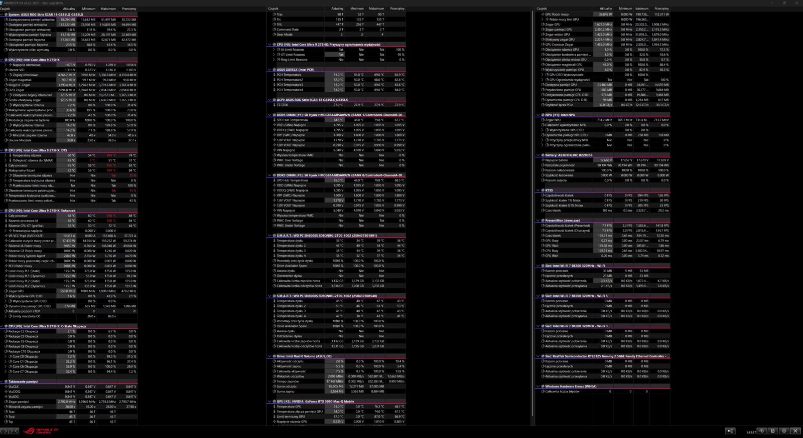 Przyznam, że nigdy nie sądziłem, że dotrzemy do czasów, w których granie w 2K na najwyższych ustawieniach z flagową kartą graficzną w mobilnym wydaniu będzie tak płynne. No, nie myliłem się co do tego aż tak, bo gdyby nie magia DLSS oraz generowania klatek (więcej o najnowszych technologiach NVIDIA przeczytacie tutaj), to stabilne 60 klatek na sekundę nie byłyby wcale takie częste w najnowszych tytułach. Są zresztą takie gry, które nawet z magią tych funkcji będą okazjonalnie rzucać nam w twarz spadkiem poniżej 60 klatek na sekundę (Black Myth: Wukong czy Hogwart’s Legacy), ale to tylko wyjątki zbudowane oczywiście na “wspaniałym” Unreal Engine 5. Nie musicie jednak bać się o to, że sprzęt pokroju ASUS ROG Strix SCAR 18 (2025) G835 z GeForce RTX 5090 złapie czkawkę w jakiejkolwiek nowej grze, bo z odpowiednimi ustawieniami utrzymanie nawet stabilnych 144 klatek na sekundę nie jest niczym szczególnie trudnym. Sprzęt nie ma jednak łatwo. Zrzut ekranu z HWInfo po całej procedurze testowania wskazuje, że procesor osiągnął temperature 108 stopni i pożerał maksymalnie 159 watów, podczas gdy karta graficzna maksymalnie zjadała 190 watów, a jej rdzeń rozgrzał się do 76,3 stopni.