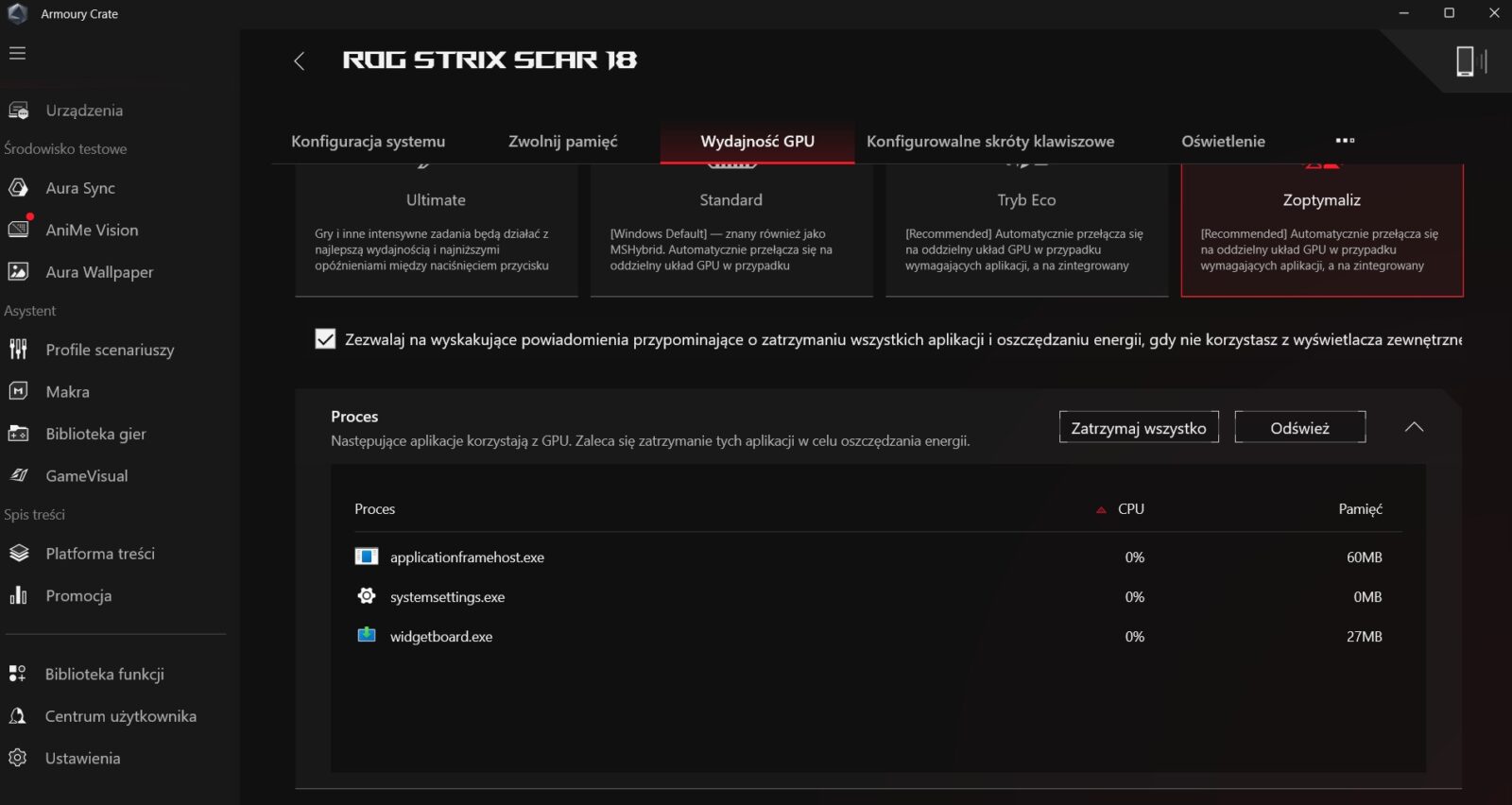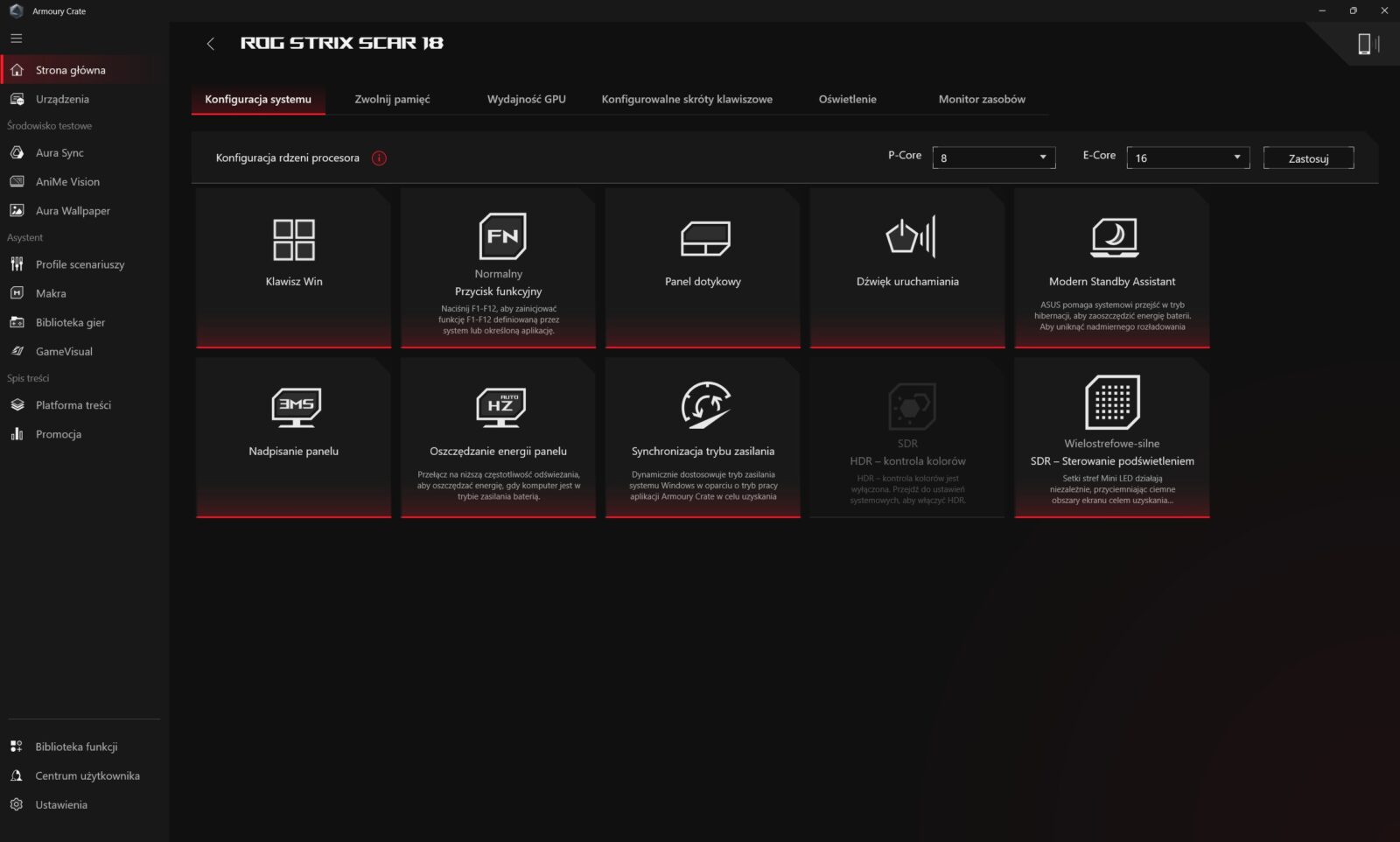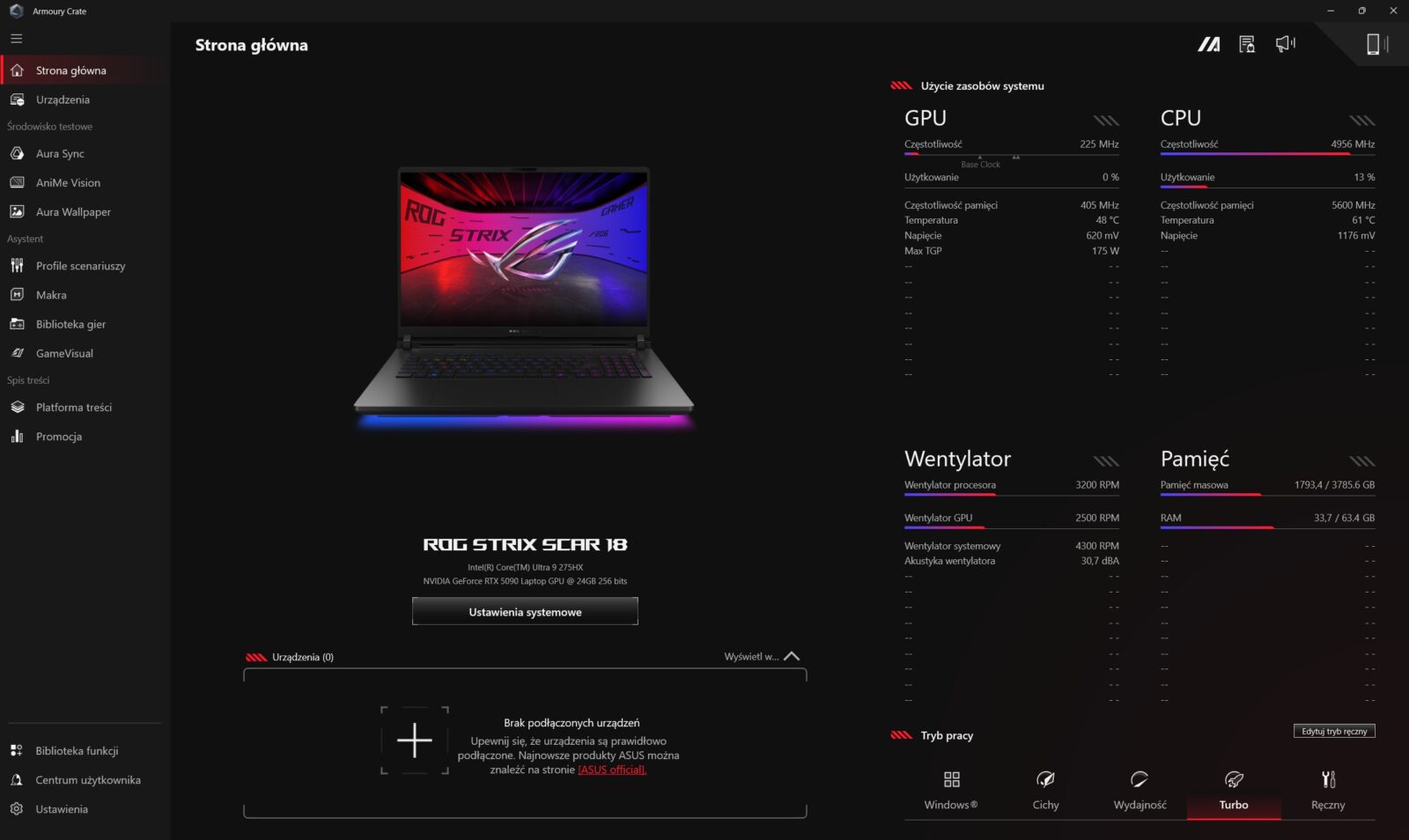 Przygoda z ASUS ROG Strix SCAR 18 (2025) G835 była ciekawa. Zwłaszcza po przeskoczeniu z zupełnie innej klasy laptopa, bo ASUS ROG Flow Z13 2025, czyli mobilnego i wyjątkowego modelu, którego nie sposób znaleźć nigdzie indziej. 18-calowy ekran Mini LED robi robotę zarówno w pracy, jak i podczas grania, tryb cichy pozwala pracować nawet w bardziej wymagających aplikacjach bez wrażenia przebywania w jednym pokoju z odkurzaczem, a każde wyjście z tym laptopem to wielka przygoda, bo sprzęt to najbardziej mobilnych nie należy. Nie możecie też liczyć na specjalnie wysoką wytrzymałość na jednym ładowaniu, bo choć to trwa dosyć krótko (~60 minut do 80% i ~90 minut do 100%), to akumulator nigdy nie wytrzyma wam całego dnia mimo obietnic producenta. Jeśli gracie lub obciążacie bardzo sprzęt, a do tego angażujecie dGPU i pełne podświetlenie to możecie liczyć na 40-80 minut, po czym laptop się wam wyłączy. Ograniczenie podświetlenia, jasności i wydajności zwiększy ten czas do maksymalnie 150 minut (zależnie od gry), a jeśli liczycie na osiem godzin przy stricte biurowej pracy, to niestety was rozczaruje – wykręcicie maksymalnie trzy, góra cztery godziny, pracując w przeglądarce nawet na najbardziej energooszczędnych ustawieniach.
