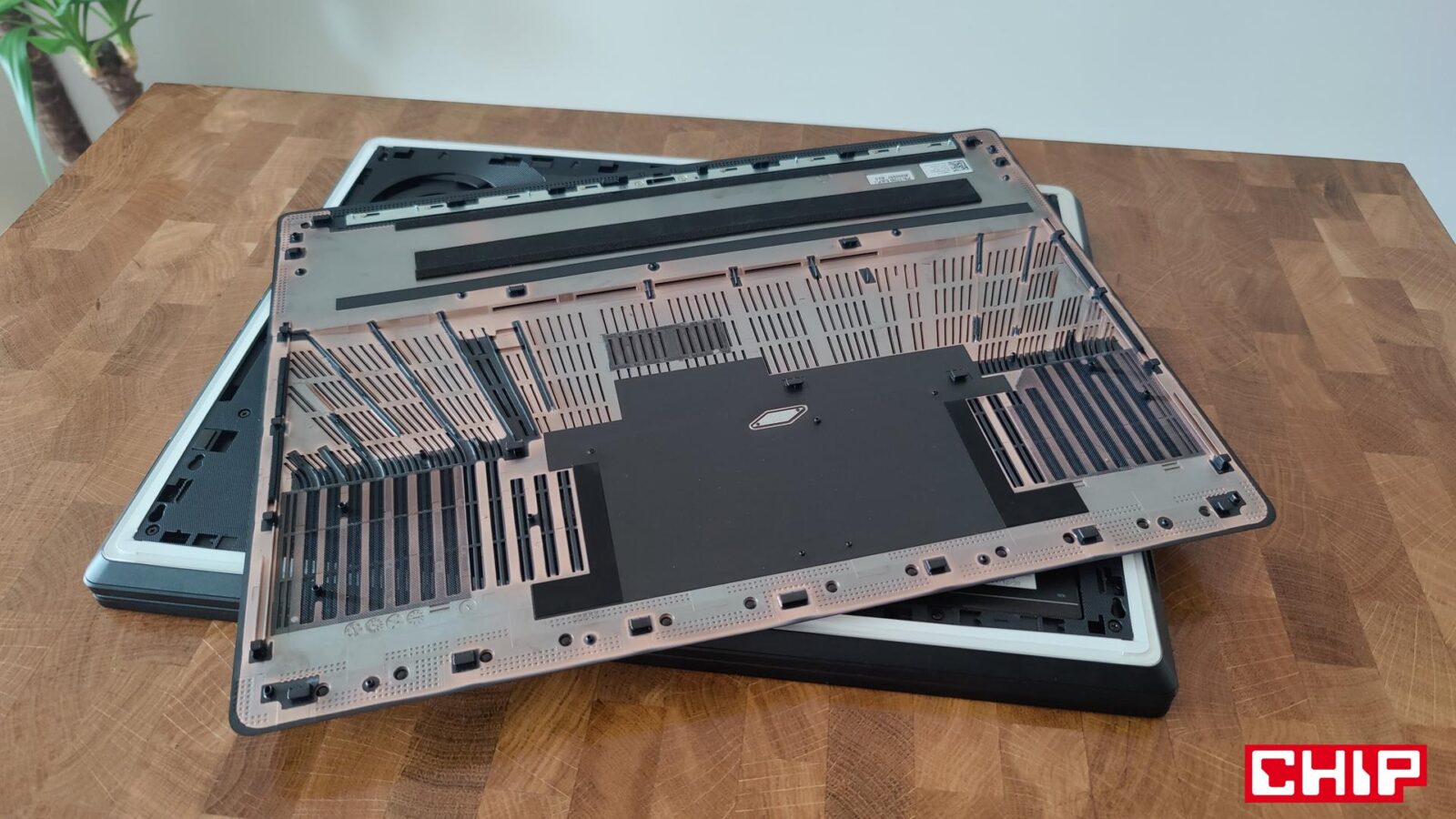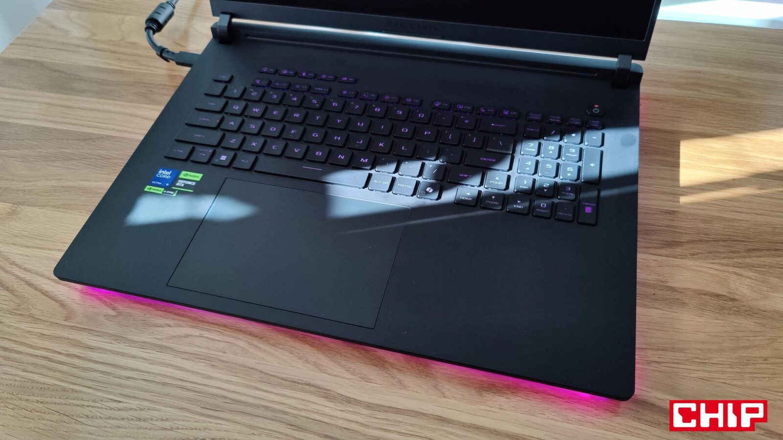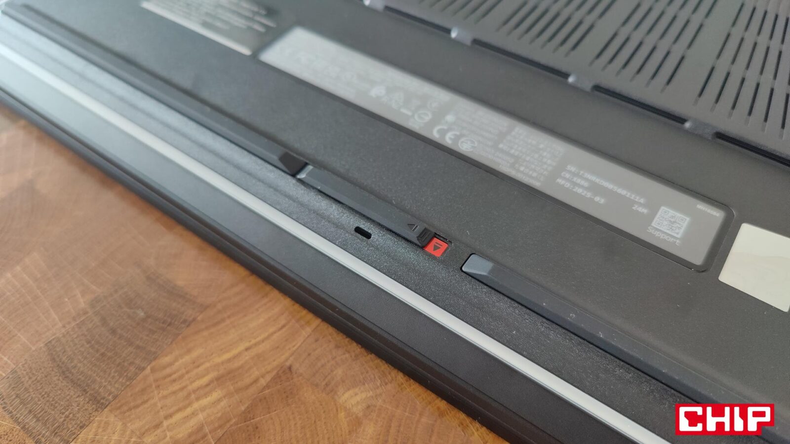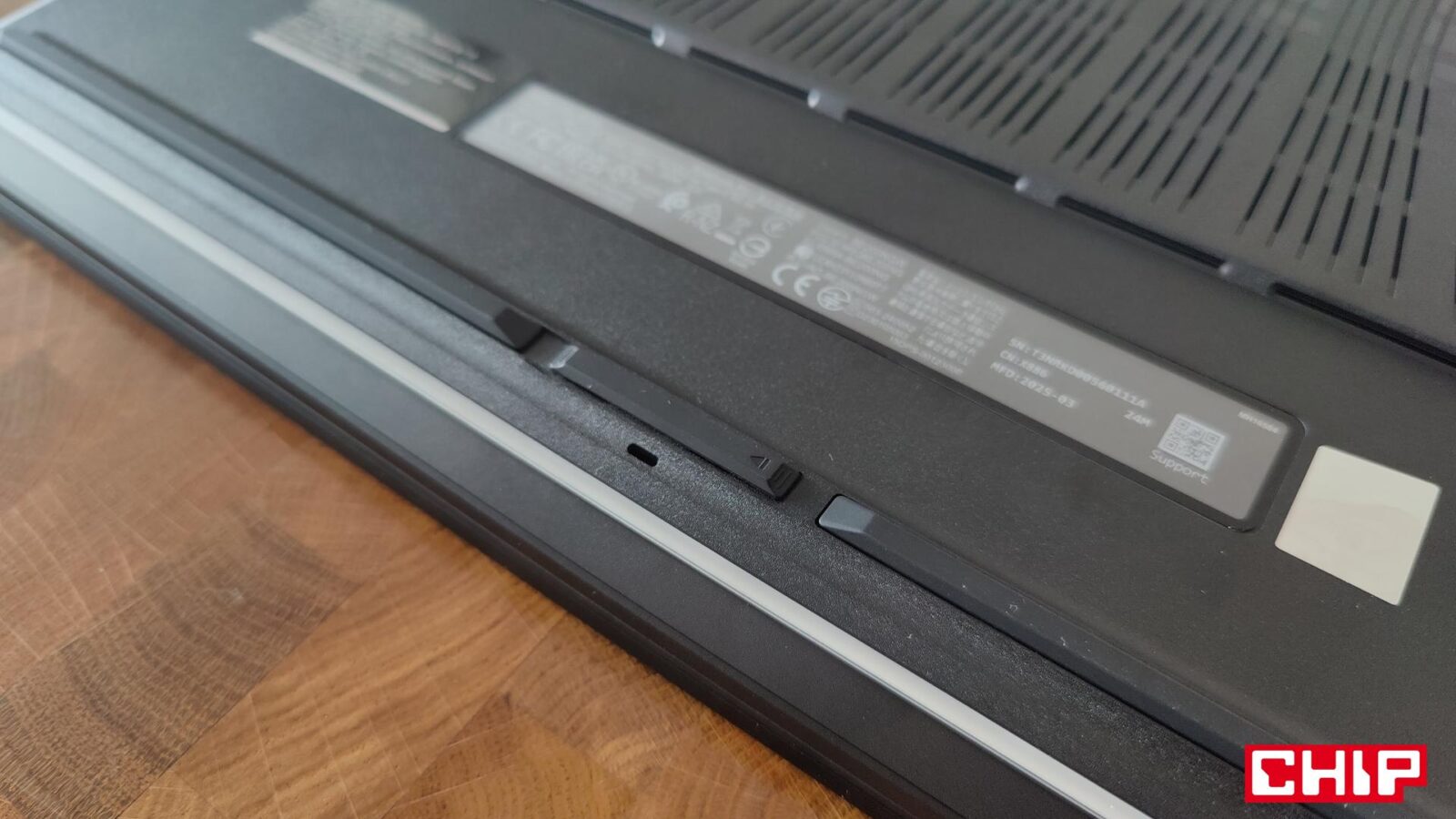 Poza tym możecie liczyć na w pełni podświetlaną klawiaturę niskoprofilową z blokiem numerycznym i pięcioma dodatkowymi przyciskami makr (ładna, wytrzymująca do 20 mln aktywacji, ale niepowalająca systemem aktywacji), większy touchpad względem poprzednich modeli z serii o bardzo gładkiej strukturze i… właśnie wspomniany panel na spodzie pełen perforacji pełniących rolę wlotów chłodnego powietrza (stąd też wysokie i wielkie gumowe podkładki), którego możemy zdjąć w sposób beznarzędziowy. Rewolucja, co nie?