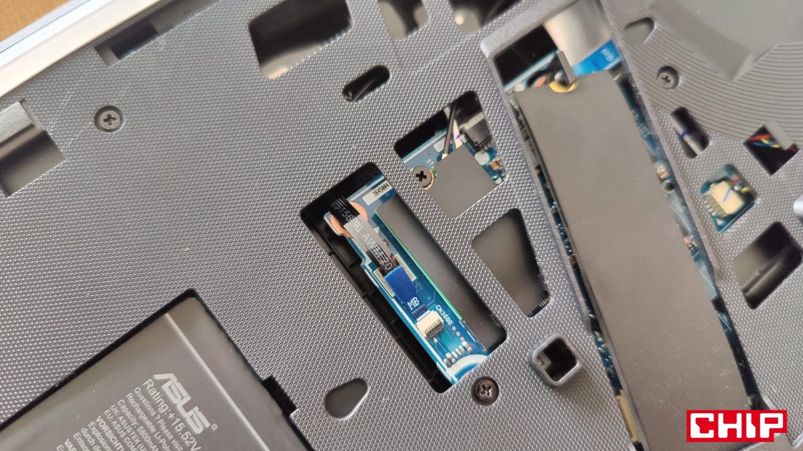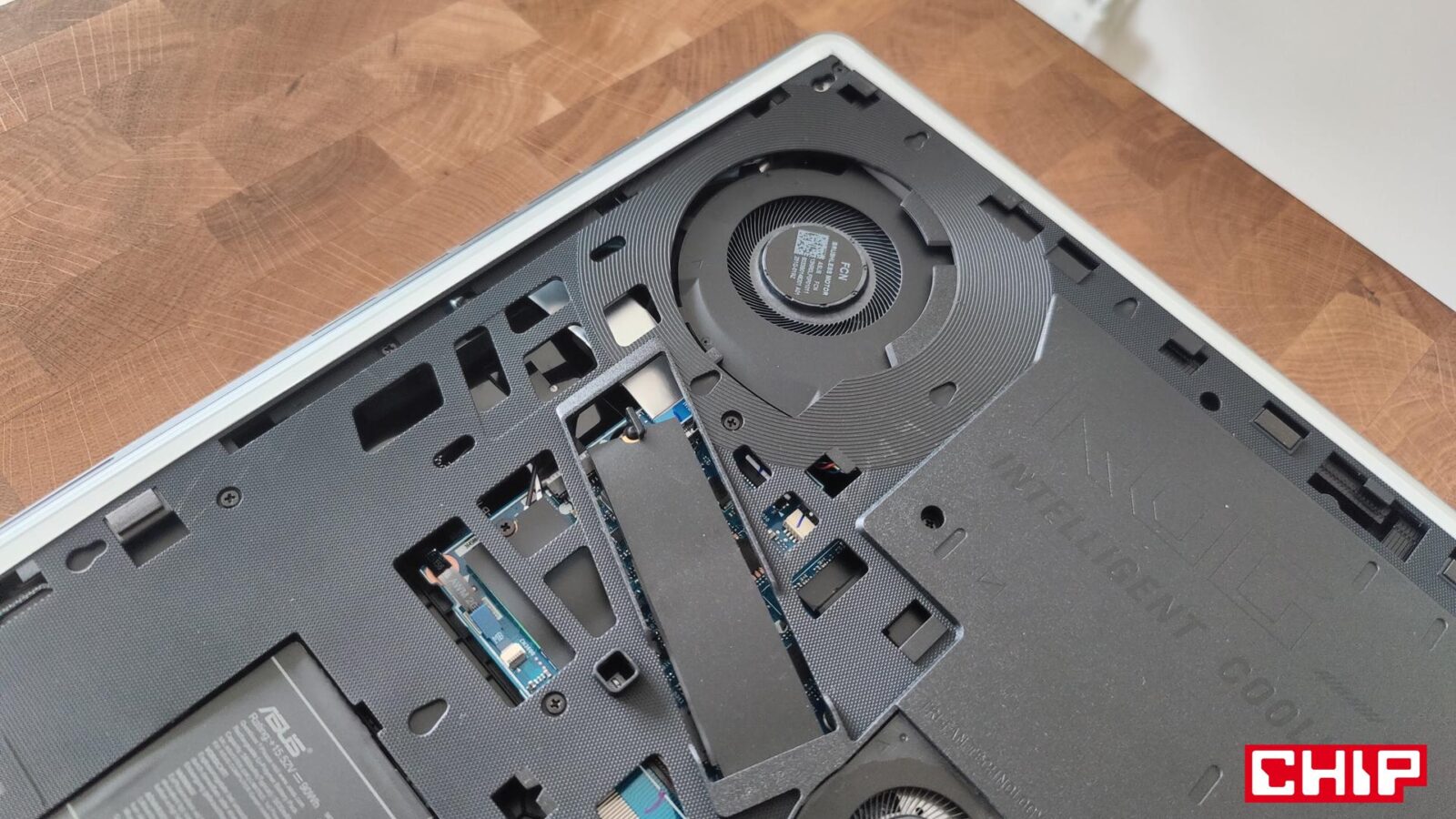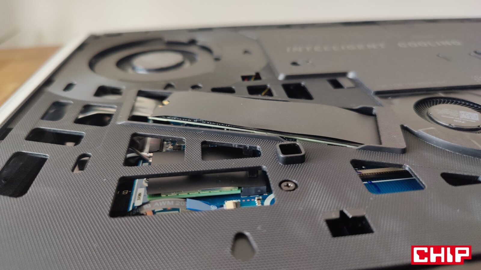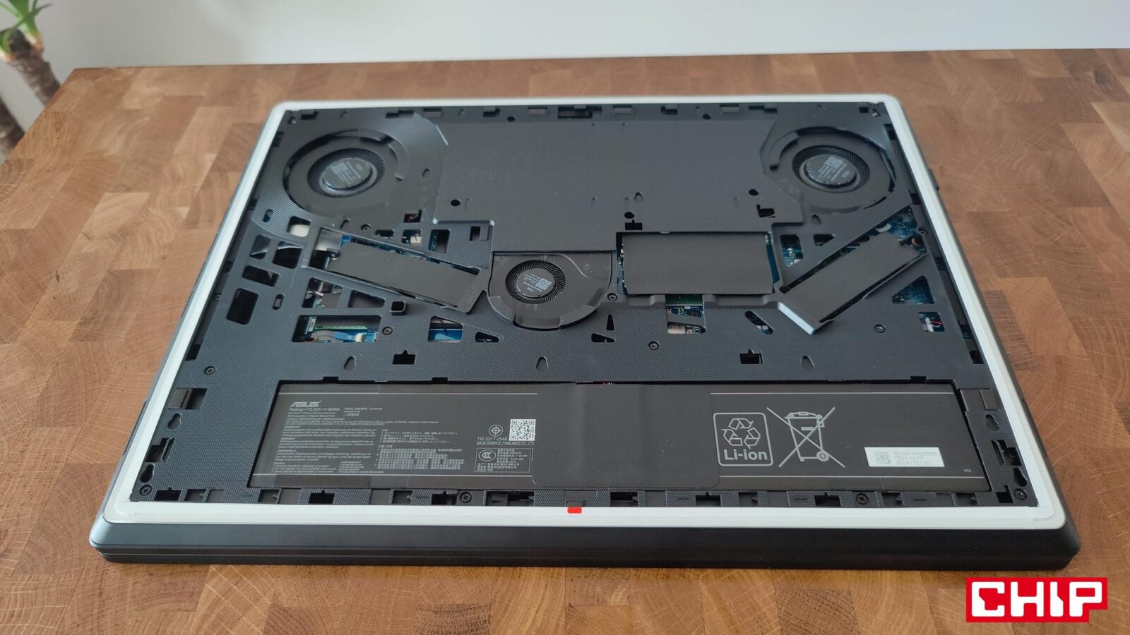 Ile to razy w ciągu tygodnia, miesiąca i tym bardziej roku zaglądacie we wnętrze laptopa, żeby podkręcić dzyngsa, wyżyłować tentegesa albo wymienić inny wihajster. Zliczyć się nie da, co nie? Na całe szczęście ASUS uratował nas od tego regularnego odkręcania brzydko wyglądającego zestawu ponad 10 śrubeczek. Po prostu ciągniemy w bok ukrytą dźwigienkę, popychamy delikatnie panel i podważamy, a w efekcie zdejmujemy całą pokrywę i odkrywamy poniekąd drugi panel (już ze śrubkami), który odkrywa w pełni trzy wentylatory, dwa dyski, dwie kości RAM oraz akumulator. Mamy też dostęp do karty sieciowej, a to wszystko po to, aby… no cóż, lubię składać komputery, ale nie dostrzegam zbyt dużego sensu w tego typu rozwiązaniu, jeśli chcemy uznać je za bardzo cenny dodatek w projekcie laptopa.