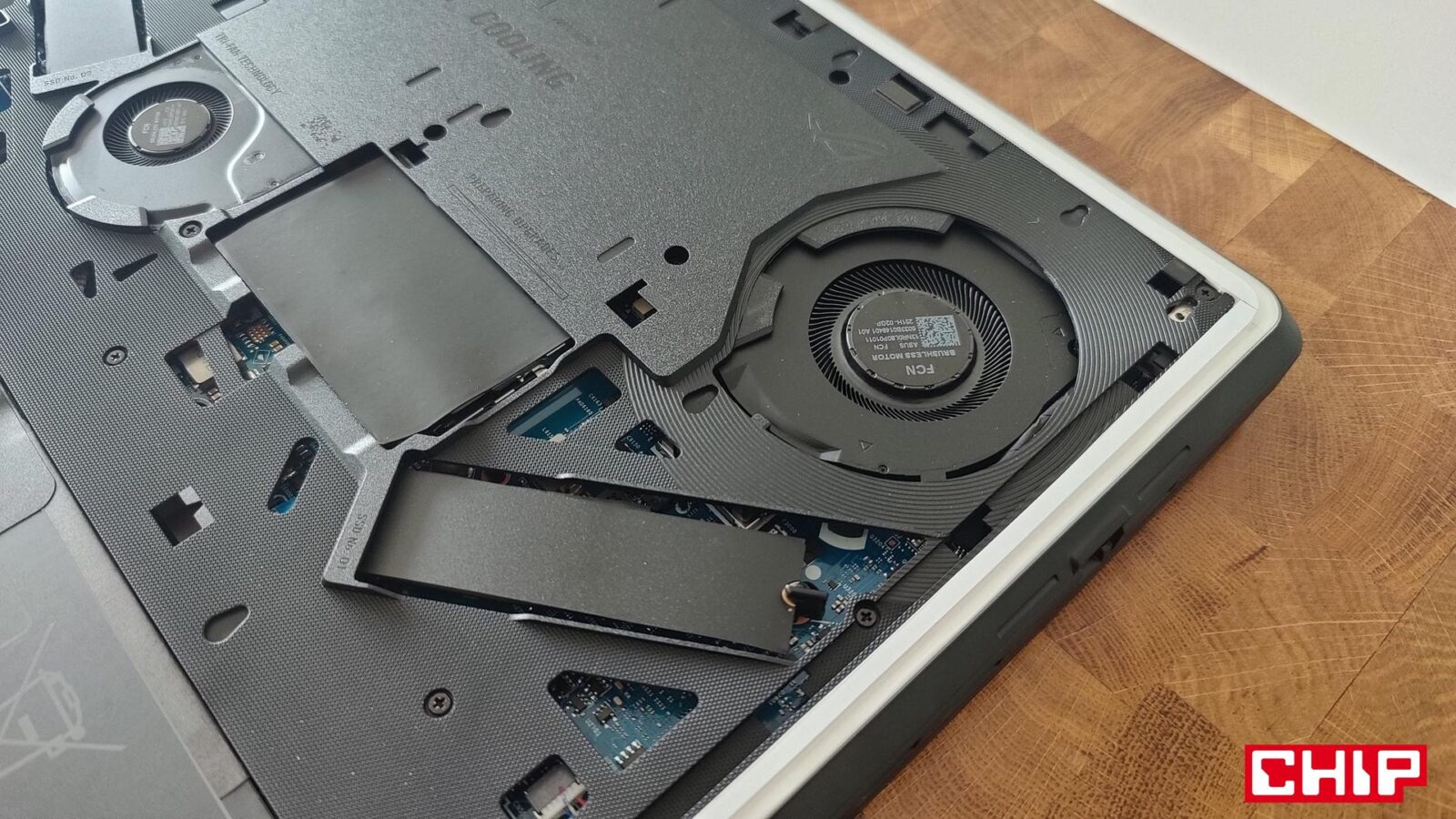 ASUS chwali się zastosowanym w tym modelu systemem chłodzenia, ale jeśli liczycie na brak efektów odrzutowca w pokoju, to tutaj was rozczaruję. Chociaż sam system oparty o trzy wentylatory działa efektywnie, zbierając zimne powietrze spod laptopa i przedmuchując nim wewnętrzny radiator pracujący w tandemie z komorą parową, to poziom jego głośności jest niski przy pracy (ot lekki szum), ale podczas grania… cóż, 53,5 dBA w trybie Turbo zmuszą was do sięgnięcia po dobrze wygłuszające słuchawki, a najlepiej po takie z ANC.