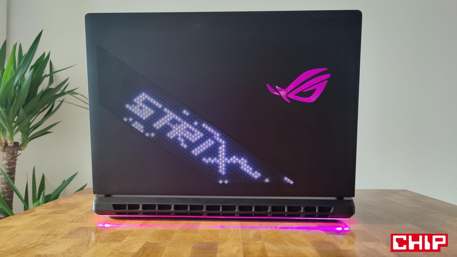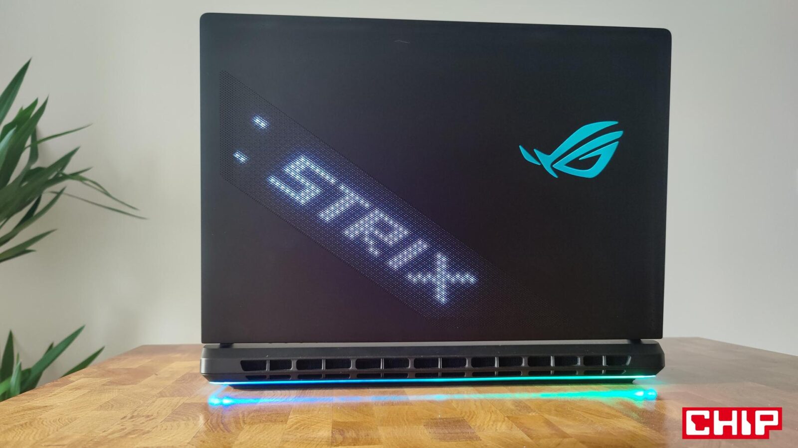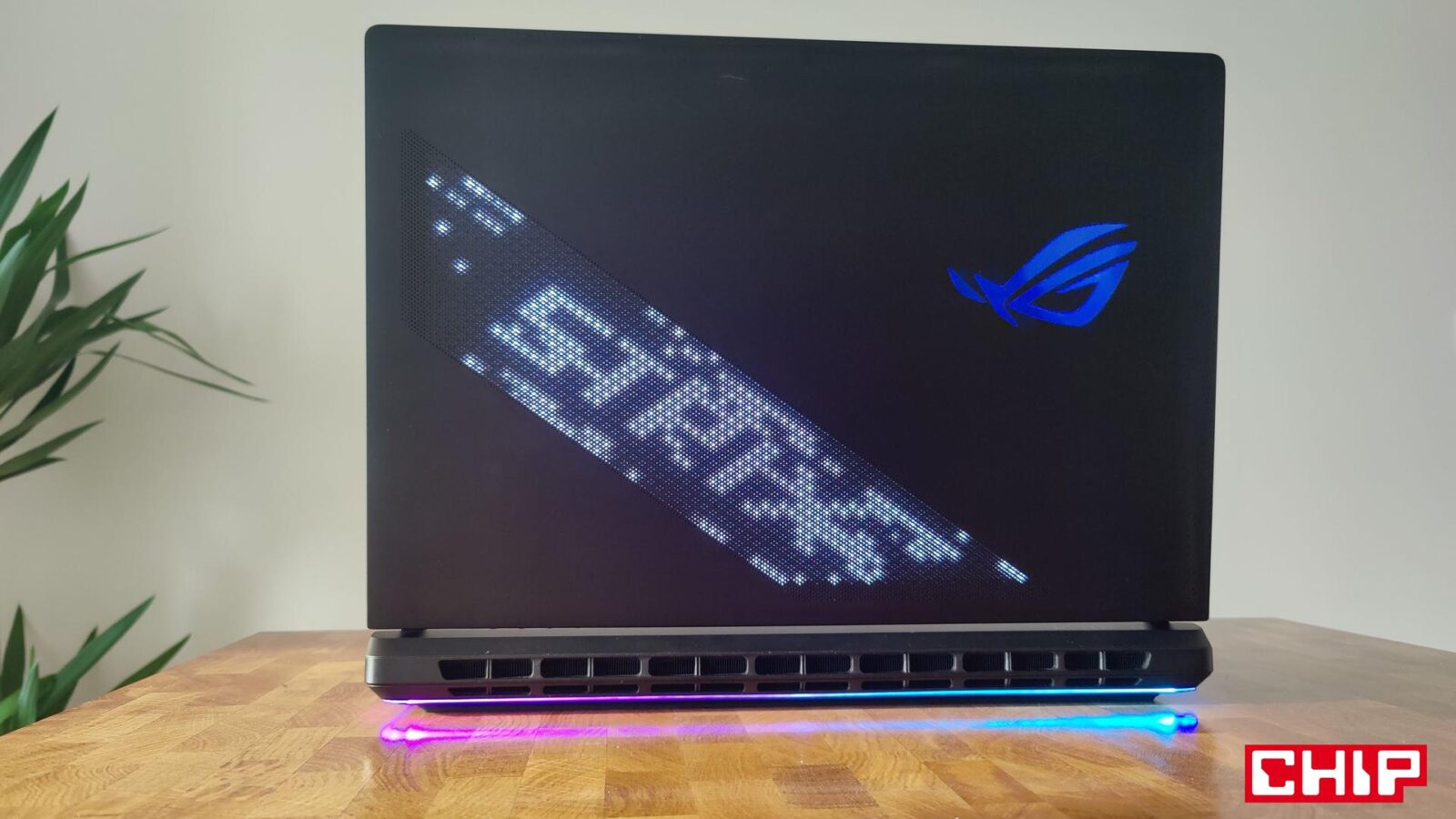 Zewnętrzny projekt ROG Strix Scar 18 (2025) ma z kolei kupić nas łącznie dwoma cechami – podświetleniem (jest obecne na każdej krawędzi podstawy i w dwóch sekcjach na pokrywie) oraz panelem dolnym zdejmowalnym w sposób beznarzędziowy. O ile same podświetlenia robią wręcz ogromne wrażenie, bo rozświetlają całe biurko i ścianę mocą RGB (nieaktywne logo producenta przyjmuje formę chromowanego elementu), tak ASUS podkręcił dodatkowo temperaturę systemem-wyświetlaczem AniMe Vision.