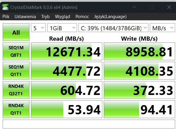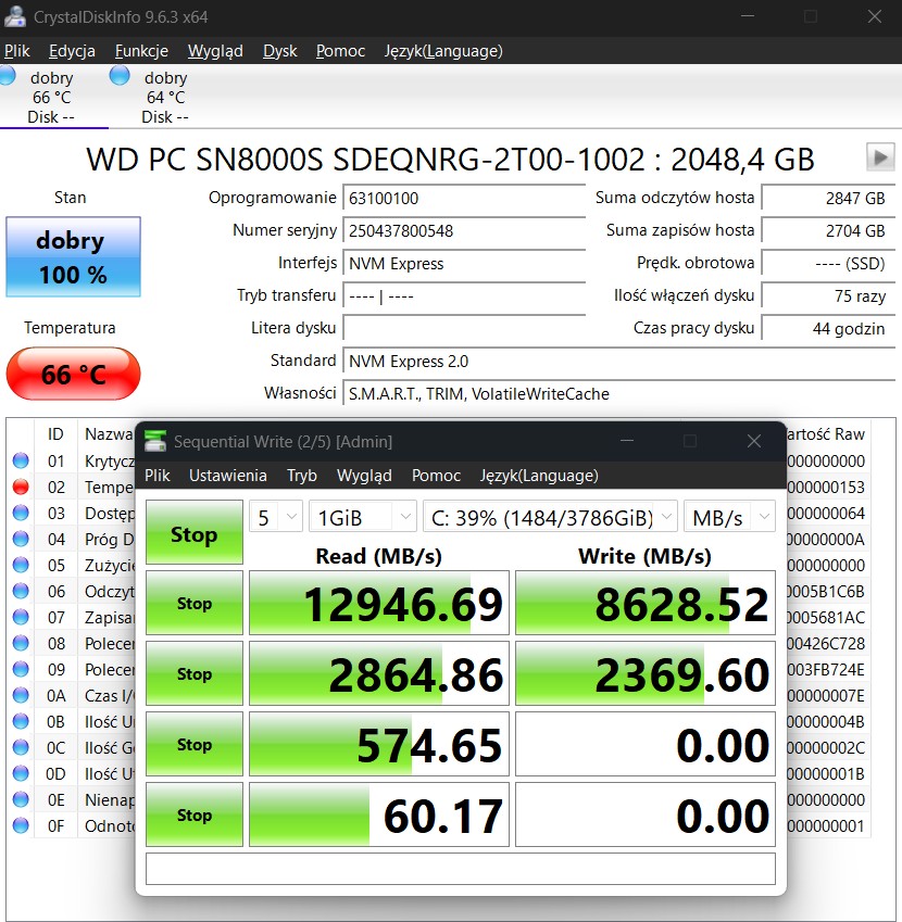 Czy to wręcz spełnienie marzeń? Jeszcze jak, bo nawet pamięć masowa robi tutaj wrażenie, choć oczywiście szkoda, że w takim sprzęcie nie ma jeszcze dostępu do nowszego standardu PCIe 5.0. Z drugiej jednak strony spójrzcie tylko – wyniki sekwencyjne są wręcz powalające nawet na tle najnowszych nośników na PCIe 5.0, dzięki konfiguracji RAID 0. Brak jakiegokolwiek poważnego chłodzenia doprowadza jednak do znacznego skoku temperatury z okolic 45-50 stopni podczas pracy biurowej do 65 stopni przy benchmarku. Nie jest to jednak niebezpieczna granica 70-80 stopni dla dysków SSD, ale i tak szkoda, że ASUS nie zastosował stosownego chłodzenia dla obu nośników.