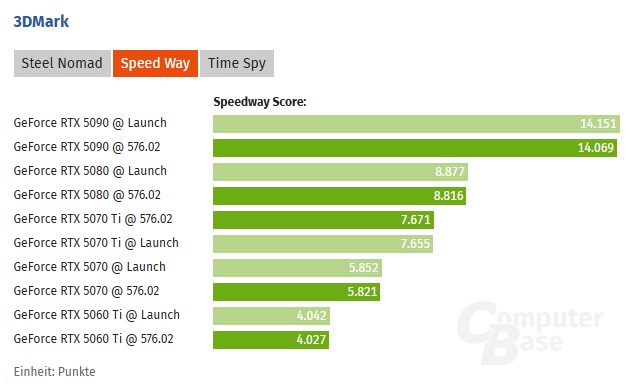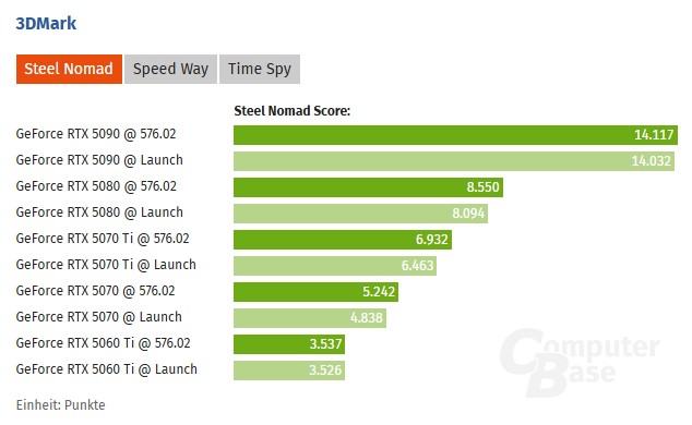 Użytkownicy społeczności ComputerBase z procesorami graficznymi RTX 5070, 5070 Ti i 5080 zgłosili wzrost wyników o trzy do ośmiu procent po aktualizacji