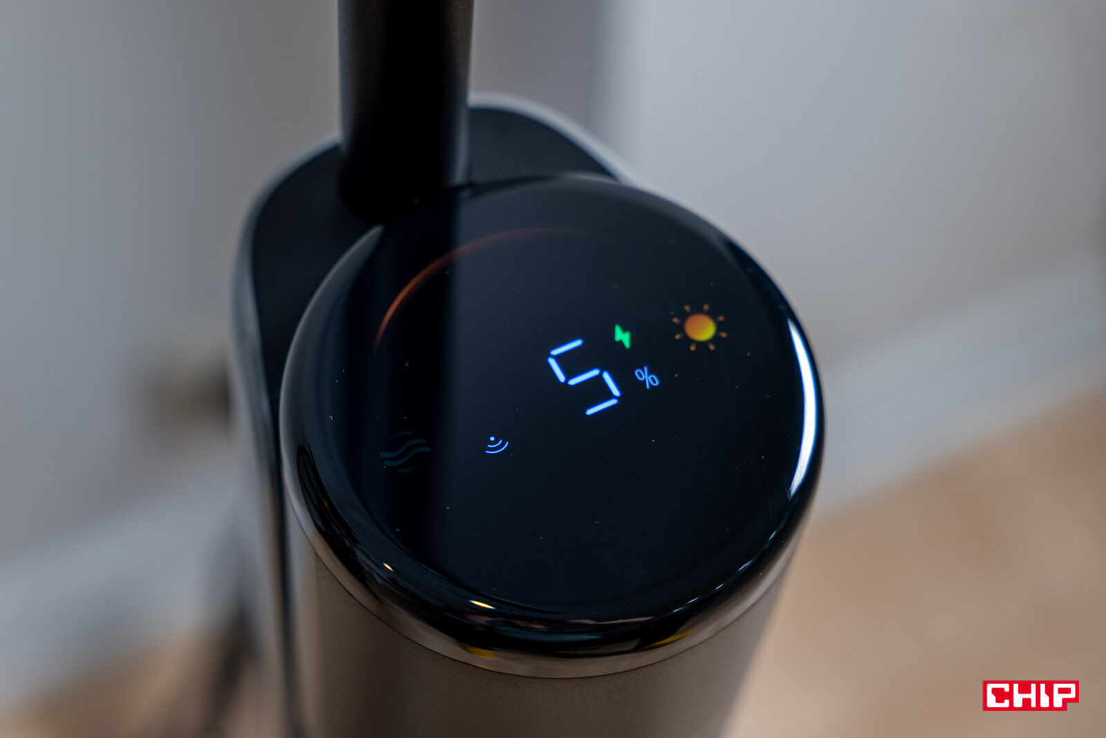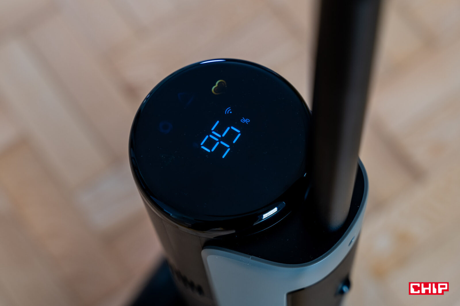 Jedną z takich rzeczy jest wyswietlacz, który poziom naładowania wyświetla zawsze w kierunku zgodnym ze stanem urządzenia. W stacji dokującej procent czyszczenia czy naładowania odkurzacza będzie prezentował się do zewnątrz, zaś podczas pracy – do wewnątrz i w naszym kierunku. Mała rzecz, a cieszy, podobnie jak duży, czytelny wyświetlacz korzystający z kolorowego podświetlenia celem informowania o aktualnej mocy, z ikonami czterech głównych trybów oraz procentowym wskaźnikiem ładowania oraz… ikoną połączenia z Wi-Fi. Tak, to też wyjaśnię, ale najpierw zajmijmy się robotycznym ramieniem.