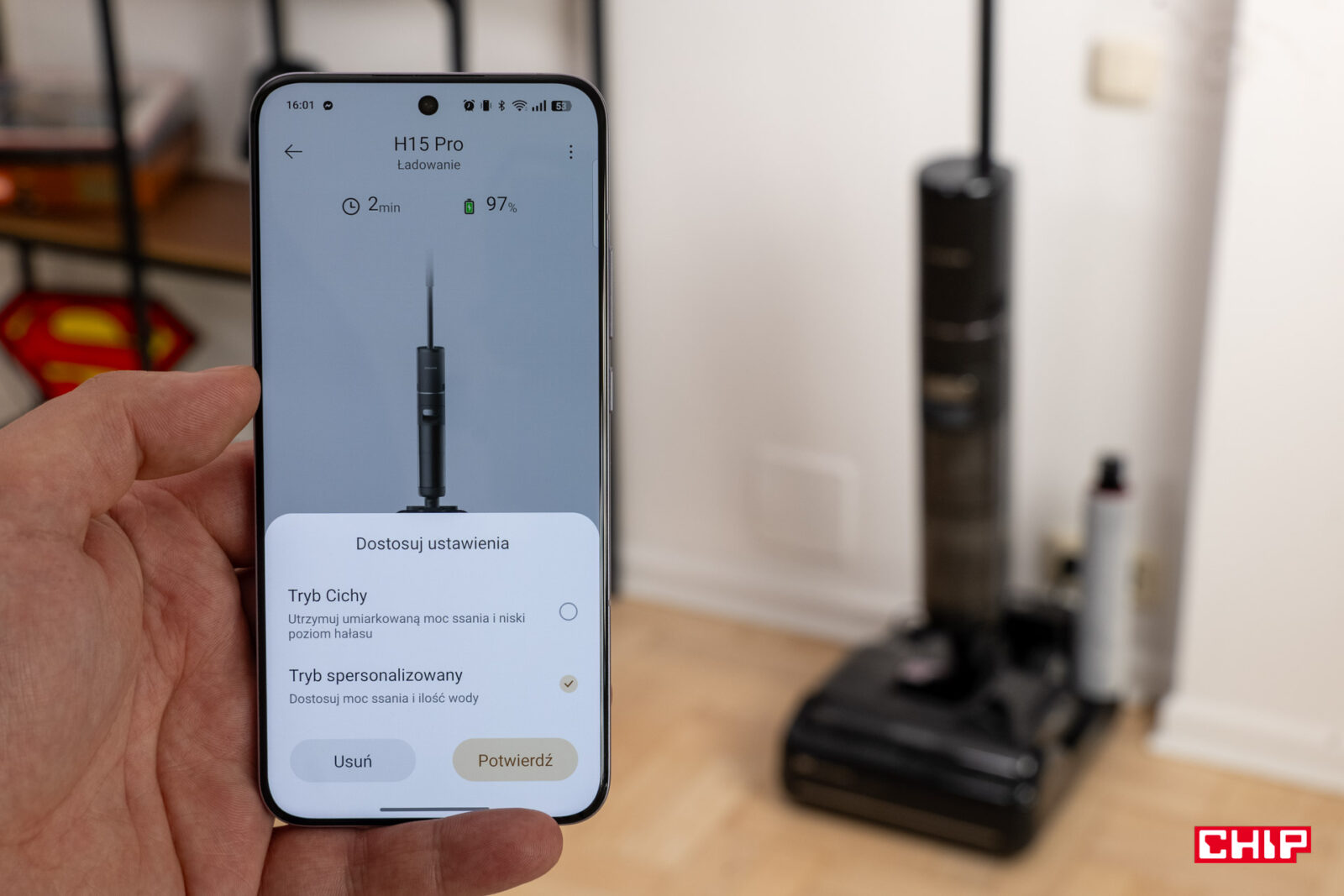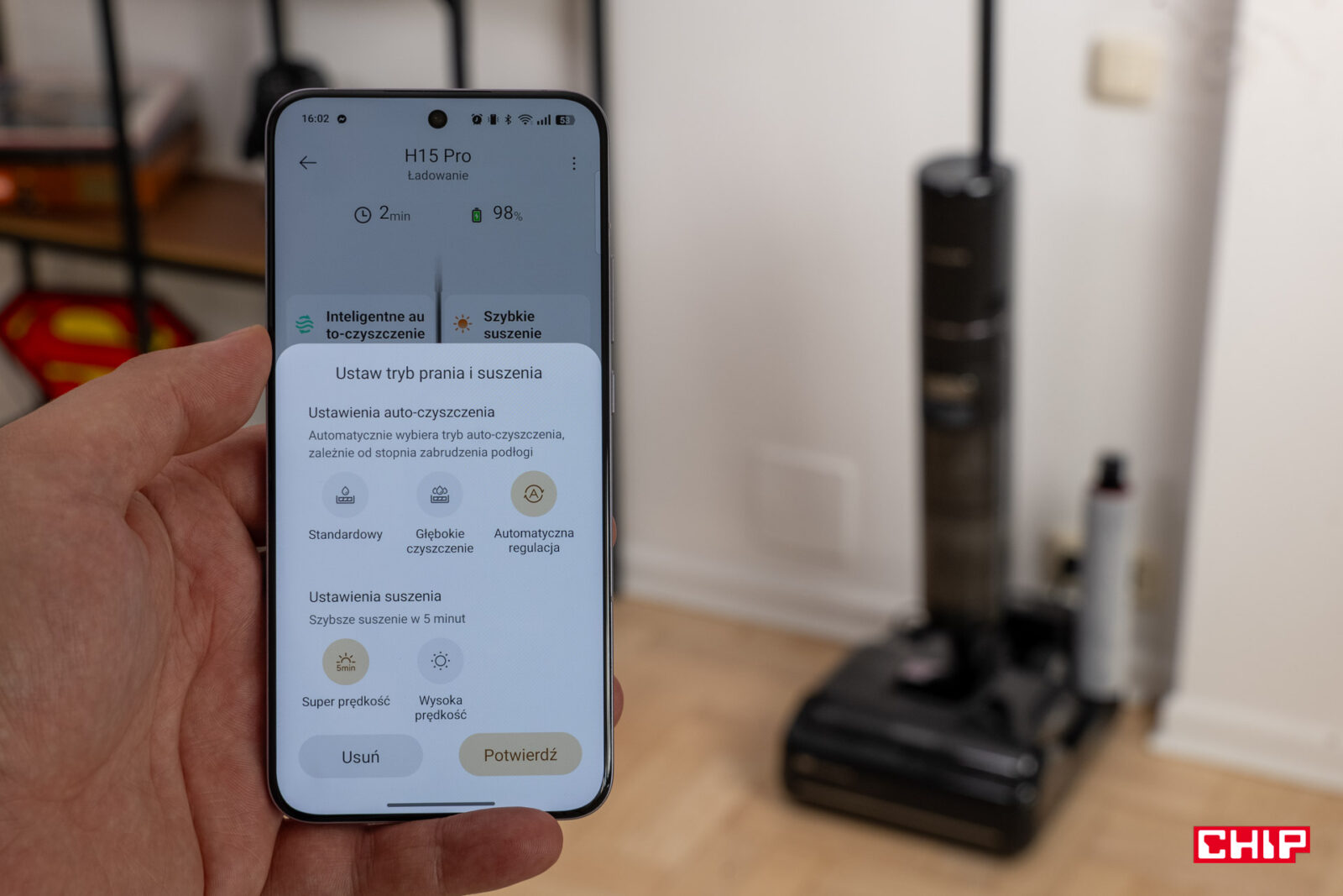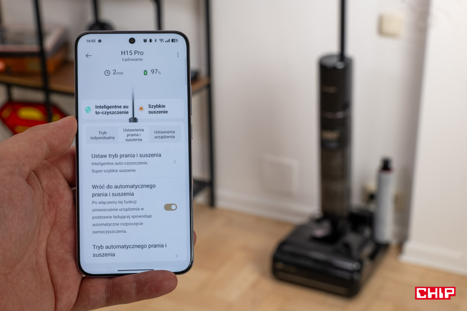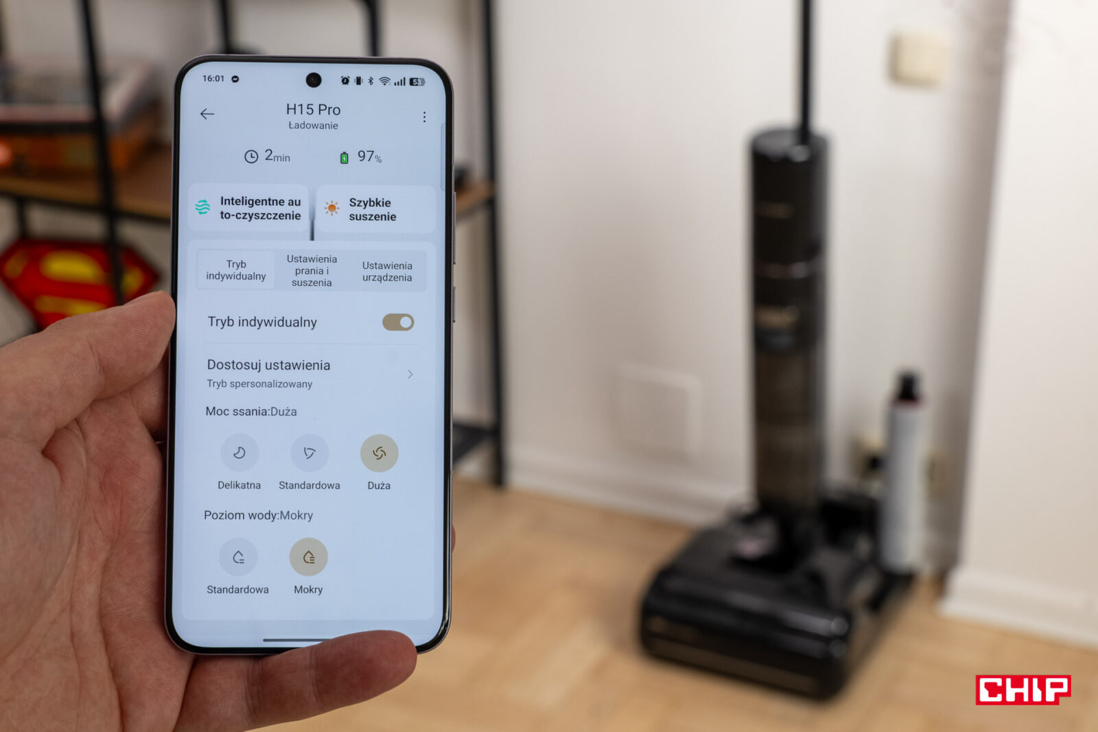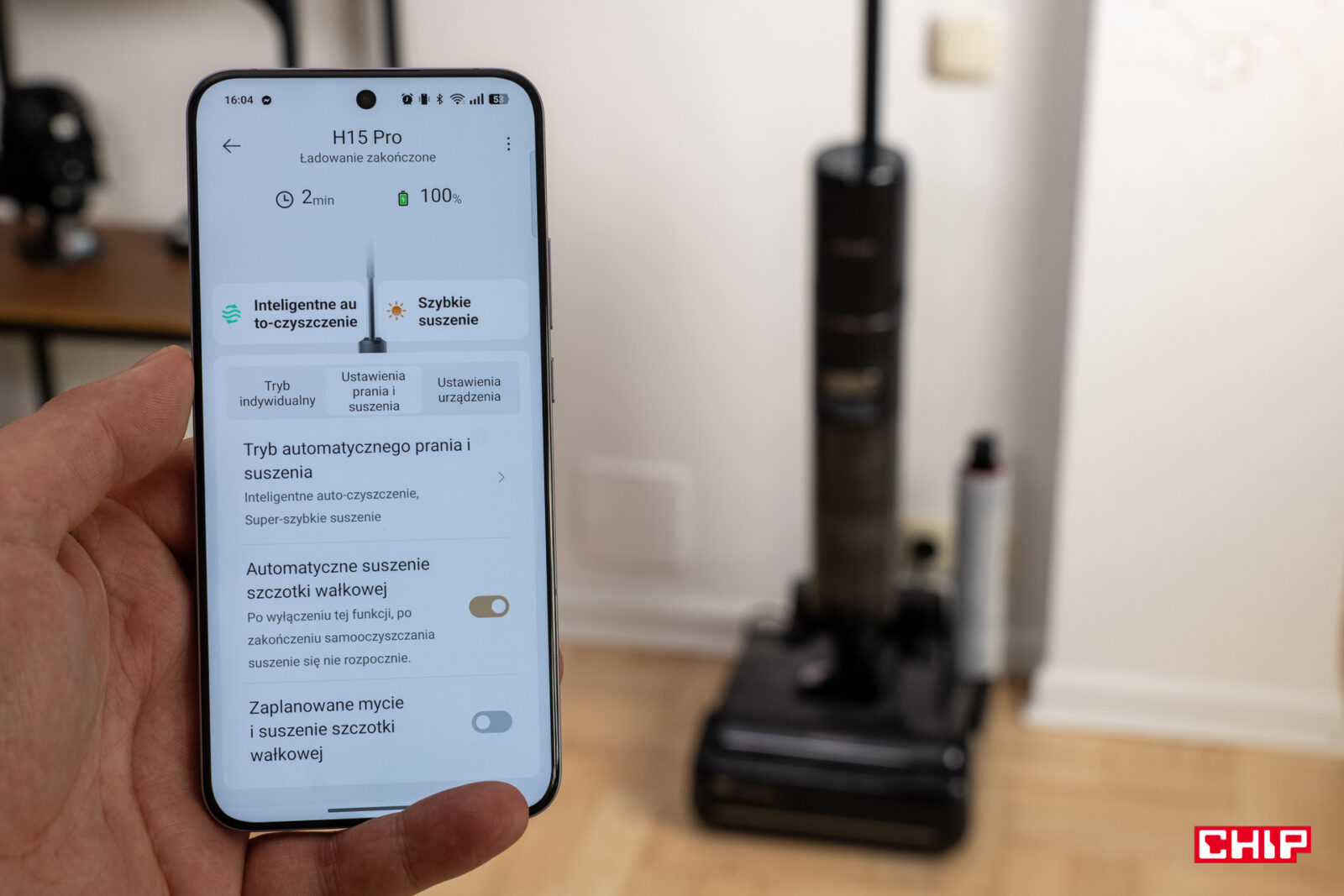 Jest tu co personalizować. Przede wszystkim możemy wybrać ustawienia trybu indywidualnego, w którym zadecydujemy o mocy odkurzania i stopniu nawilżenia szczotki. Jeśli wystarczą nam domyślne ustawienia, to przestrzeń dla tej funkcji zastąpi tryb cichy. Oprócz tego Dreame H15 Pro pozwala na personalizację tego, co dzieje się z nim po odłożeniu do stacji dokującej. Może sam decydować na bazie zanieczyszczenia, czy potrzeba zwykłego czy dogłębnego mycia. Ponadto mamy do wyboru dwa ustawienia dotyczące suszenia. Szybszy tryb suszy w około 5 minut, dokładne suszenie trwa około 30 minut. Zdecydujemy także, czy czyszczenie ma się uruchomić zaraz po włożeniu urządzenia do doku, czy chcemy decydować o tym ręcznie.