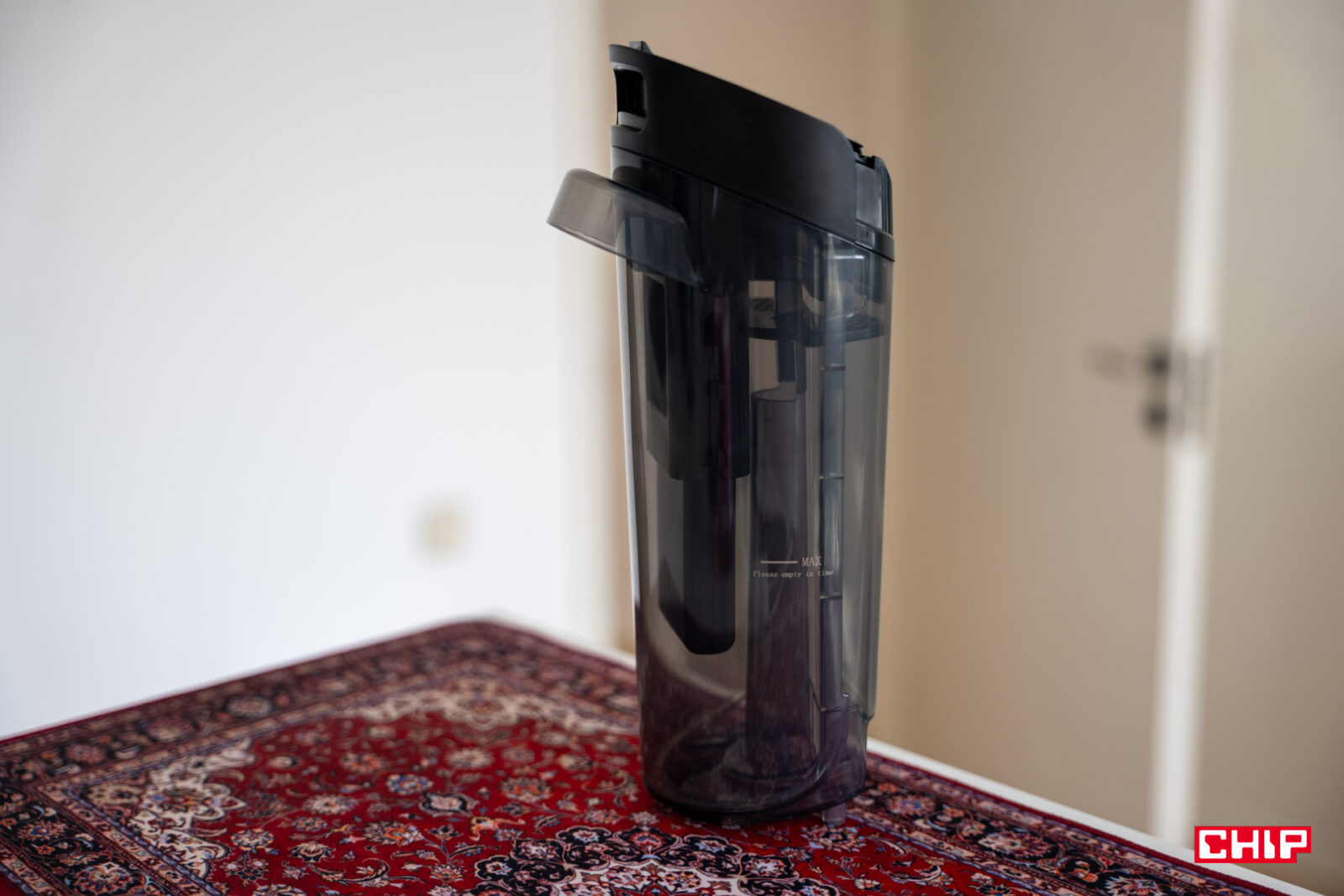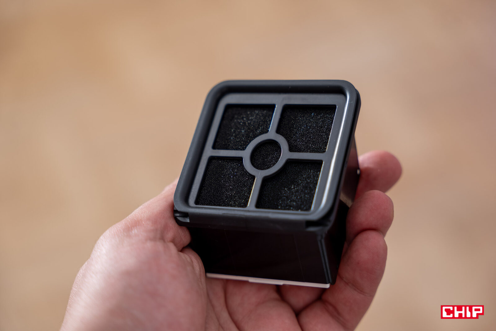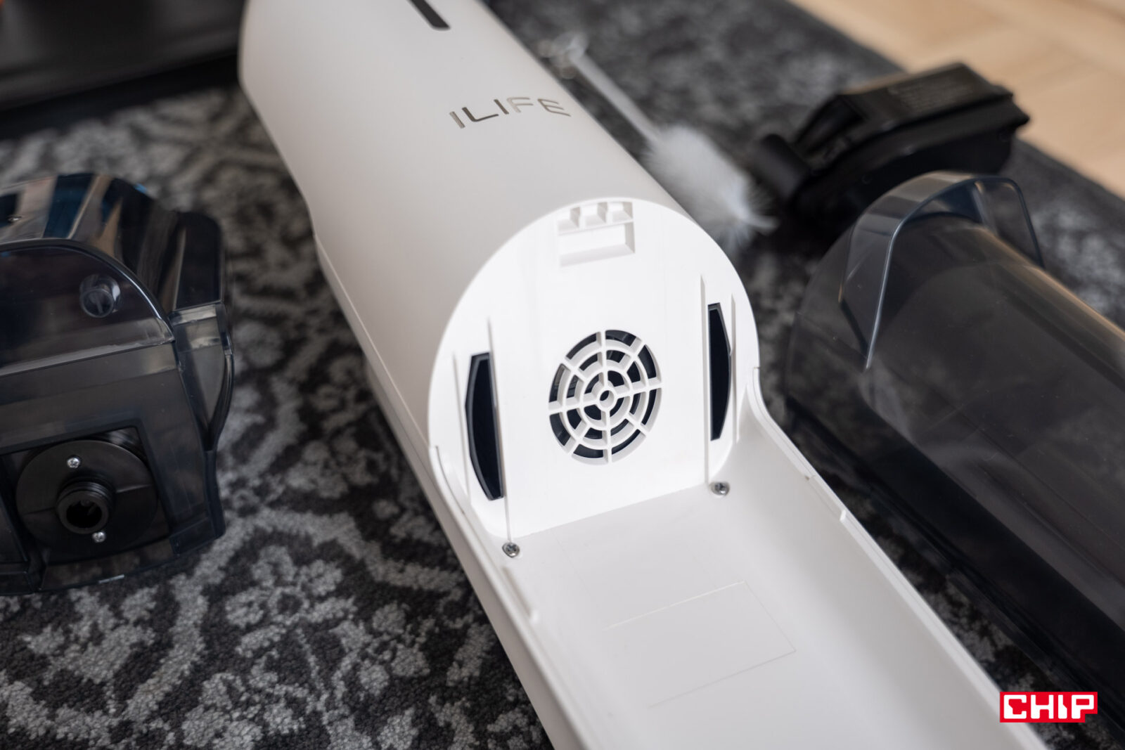 Zarzutów nie mogę mieć też do pojemników na czystą oraz brudną wodę. Ten pierwszy ma 700 mililitrów i wystarczy na sprzątanie dużych metraży. Odpady zgromadzimy w mniejszym, bo 500-mililitrowym pojemniku o wydłużonej konstrukcji, blokowanej z jednej ze stron plastikowym elementem przypominającym sitko. Oprócz tego ta część łączy się z filtrem z gąbki wielokrotnego użytku (wystarczy ją wysuszyć) oraz siatki.