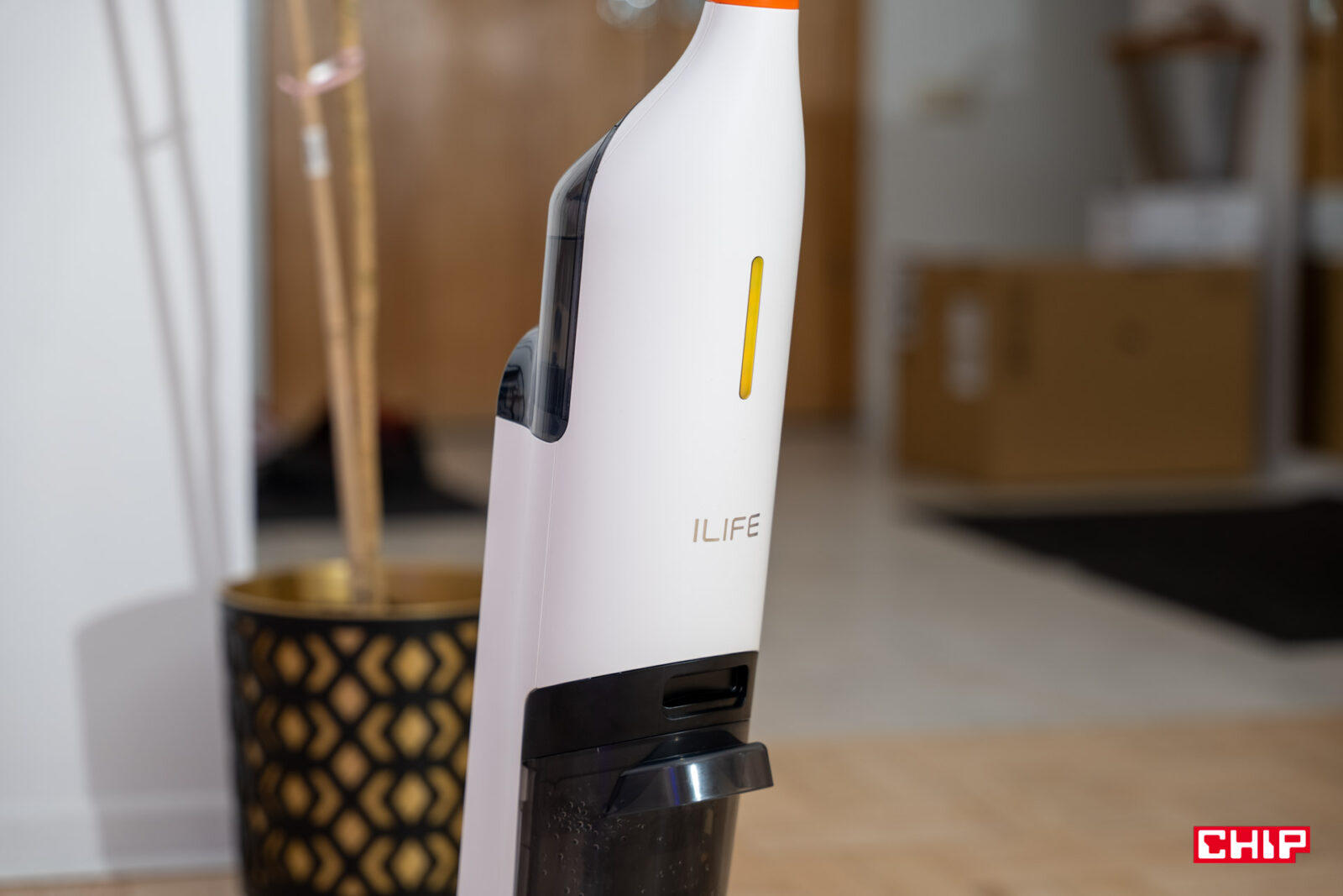Sama podstawa konstrukcji wygląda podobnie jak w o wiele droższych modelach. Miłe dla oka są pomarańczowe akcenty oraz sporych rozmiarów dioda informująca o aktualnym statusie urządzenia. To spora bryła, bo mieści w sobie nie tylko pojemniki, ale i akumulator oraz cały mechanizm ssący. Mimo tego nie czułem ze strony urządzenia oporu – iLife W90 sprawnie porusza się po podłogach.