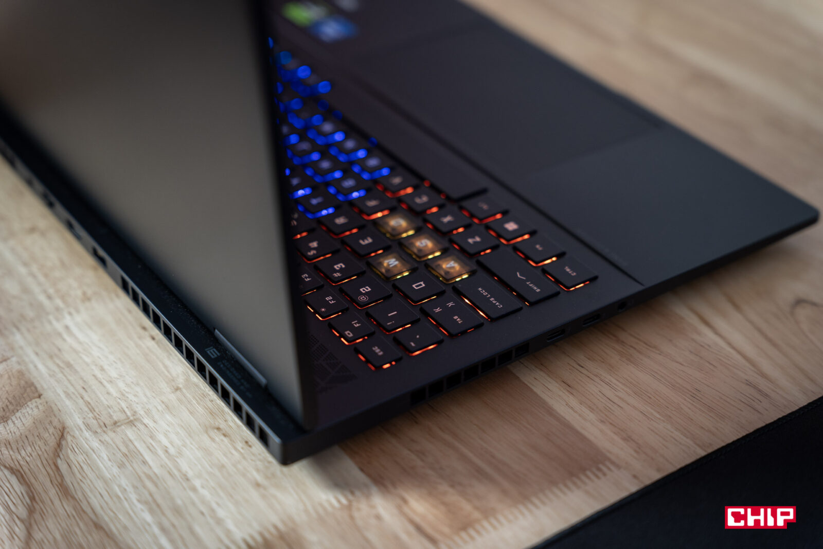 Gamingowe laptopy mają to do siebie, że ich procesory centralne i karty graficzne są okrojonymi wariantami modeli desktopowych. Tyczy się to nie tylko samych zegarów, ale nawet jednostek obliczeniowych i konfiguracji pamięci, choć to drugie zaskakuje głównie w przypadku kart graficznych, bo dziś standardem jest już przynajmniej 16 GB pamięci operacyjnej. W kwestii tej ostatniej większy model jest w moich oczach bezprecedensowym zwycięzcą, bo oddaje w ręce użytkownika dwa dostępne sloty na pamięć DDR5, podczas gdy OMEN Transcend 14 zmusza nas do pozostania na zawsze z kupioną konfiguracją z racji zintegrowania z płytą główną modułu LPDDR5X o 16-GB lub 32 GB pojemności. Wariant skromniejszy to wprawdzie dobra pojemność do gier, ale ewidentnie niezbyt przyszłościowa i ograniczająca wszelkie próby wejścia w sektor profesjonalny pokroju programowania gier, edytowania zdjęć czy montażu filmów.