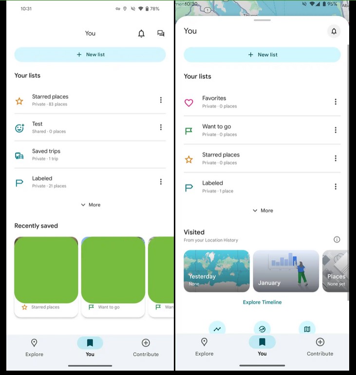 Zmianie natomiast ulegają karty, zwłaszcza “Twoje listy”. Rewolucji tu nie ma, mamy natomiast niewielką przebudowę, która zmieniła układ poszczególnych elementów, a niektóre podmieniła. Poniżej widać starą (po lewej) oraz nową wersję (po prawej). Interfejs nie wypełnia teraz całego ekranu, co może być wygodniejsze. Można zminimalizować tę stronę, tak aby zaokrąglone rogi arkusza były zadokowane do dolnego paska. Warstwa mapy (w tym pasek wyszukiwania, filtry, wskazówki FAB itd.) jest w pełni widoczna i użyteczna.