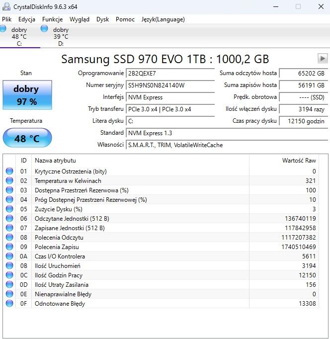W przypadku dysku mamy CrystalDiskInfo. Wyświetla on stan dysku w procentach. Jeśli macie niebieski to znaczy, że wszystko jest ok. Przy żółtym już są problemy, co oznacza już tak naprawdę konieczność jego wymiany. Można też zawsze puścić test powierzchni dysku, dostępny choćby w programie EaseUS Partition Master – tutaj też powinno być bez żadnych błędów.