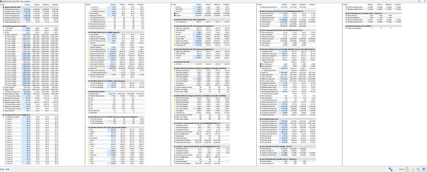 Przede wszystkim zainstalujcie HWiNFO. Jest to program, który pokaże Wam informacje dotyczące wszystkich podzespołów. Możecie podejrzeć temperaturę procesora, karty graficznej, taktowanie pamięci, napięcia itp. Jest to podstawa, jeśli chcecie sprawdzić, czy przypadkiem jakiś podzespół Wam się nie przegrzewa i czy wszystko jest ustawione jak należy (np. czy jest włączony profil XMP/EXPO pamięci, przy jakim Gear czy UCLK).