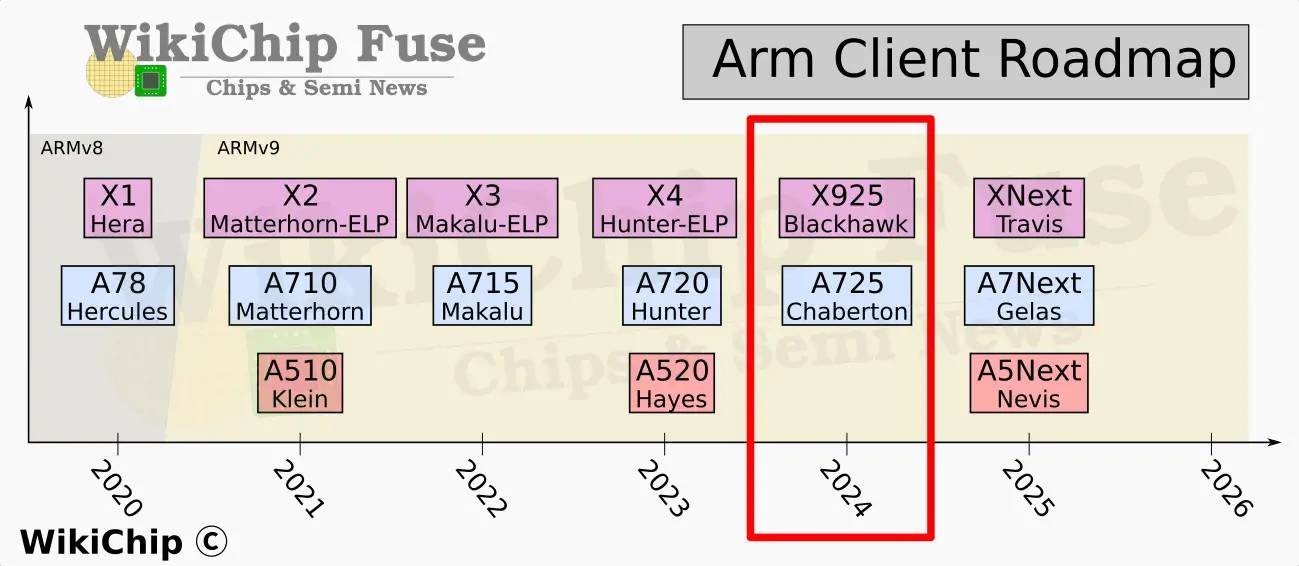 Nie wiemy co prawda, czym jest Alto, ale Travis i Gelas to kolejne rdzenie Cortex-X i Cortex-A7xx od ARM, zaś ich istnienie potwierdza harmonogram z WikiChip (poniżej). Alto nie jest małym rdzeniem, Nevis jest nowym rdzeniem typu Cortex-A5xx, więc może to być modyfikacja jednego ze starszych rdzeni A7xx. Jeśli chodzi o Travis, plotka głosi, że będzie taktowany zegarem mającym częstotliwość ponad 4 GHz.
