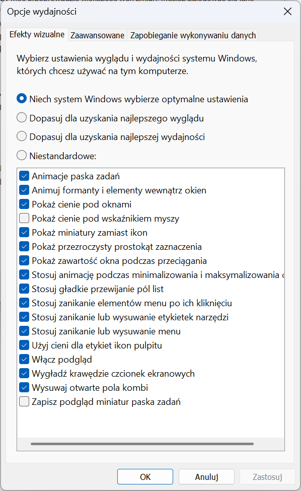 W wyszukiwarce wpisz “Dopasuj” i wybierz z wyników “Dopasuj wygląd i wydajność systemu Windows”. W panelu wybierz kartę “Efekty wizualne”. Wyłącz efekty, bez których możesz się obejść. Przełączy to ustawienia na “Niestandardowe”.