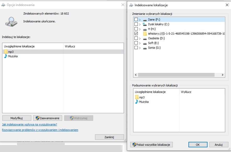 Funkcją, która jest przydatna na nowszym sprzęcie, ale może spowolnić starszy komputer, jest indeksowanie. Pełni istotną rolę, jeśli masz system na dysku HDD, a nie na dysku SSD. Wpisz do wyszukiwarki “Opcje indeksowania” i wybierz program. Sprawdź, które lokalizacje system ma indeksować, aby przyspieszyć wyszukiwanie. Kliknij Modify , aby zmienić swoje wybory.