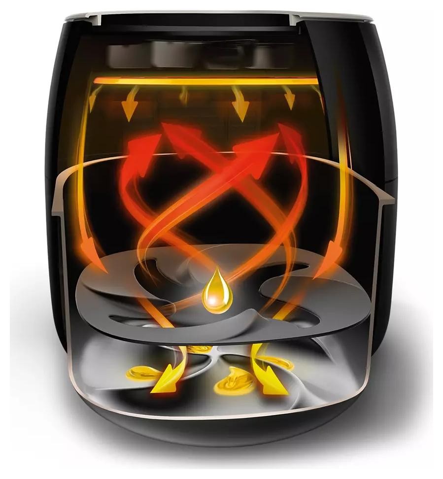 Moc nominalna wynosi aż 2225 W, dzięki czemu urządzenie rozgrzewa się błyskawicznie i utrzymuje stałą temperaturę. Technologia Rapid Air przyspiesza siedmiokrotnie cyrkulację powietrza, podnosząc sprawność w porównaniu z urządzeniami bez takiej funkcji. Philips HD9650/90 XXL wyposażony został także w technologię usuwania tłuszczu i funkcję utrzymywania temperatury już przygotowanego posiłku, tak by można go było podać wtedy, kiedy jest najlepsza chwila – podgrzewanie utrzymuje właściwą ciepłotę potrawy przez nawet 30 minut.