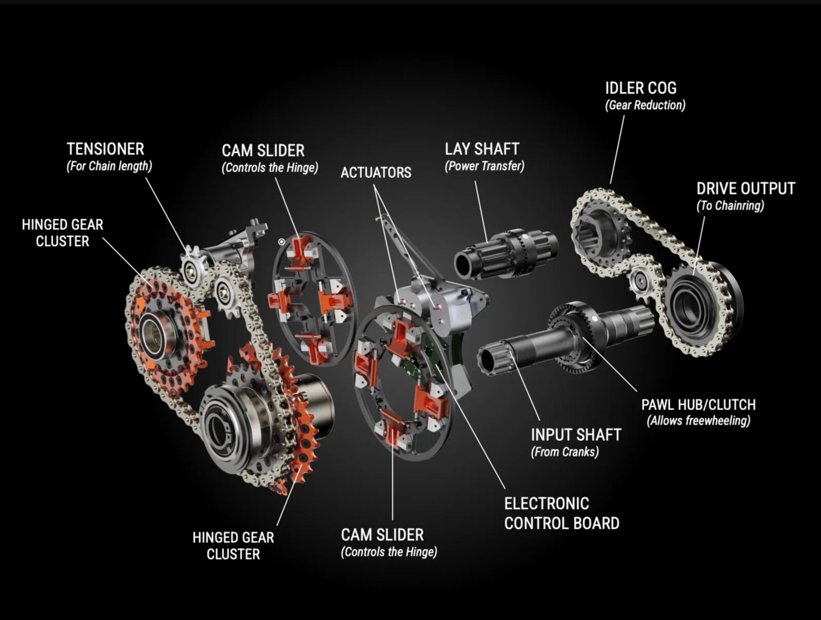 Przekładnia HiT od Praxis Works wykorzystuje unikalny system zawiasowo połączonych zestawów zębatek. Każdy zestaw składa się z mniejszego wewnętrznego koła zębatego i większego zewnętrznego, a te są połączone ze sobą zawiasem. W trakcie zmiany przełożeń zewnętrzne koło składa się nad wewnętrznym, co pozwala na płynne przejścia między biegami bez konieczności luzowania pedałowania — w przeciwieństwie do tradycyjnych systemów, które często wymagają zmniejszenia siły nacisku na pedały. Innymi słowy, z HiT możliwe jest płynne zmienianie biegów nawet podczas jazdy pod górkę bez ryzyka przeskoku czy opóźnienia, a to akurat stanowi istotne ulepszenie względem klasycznych przerzutek.