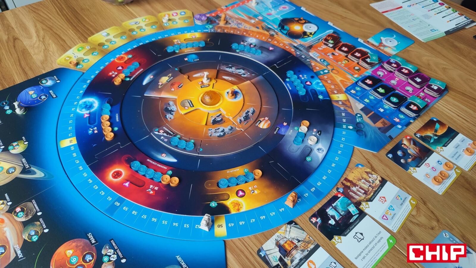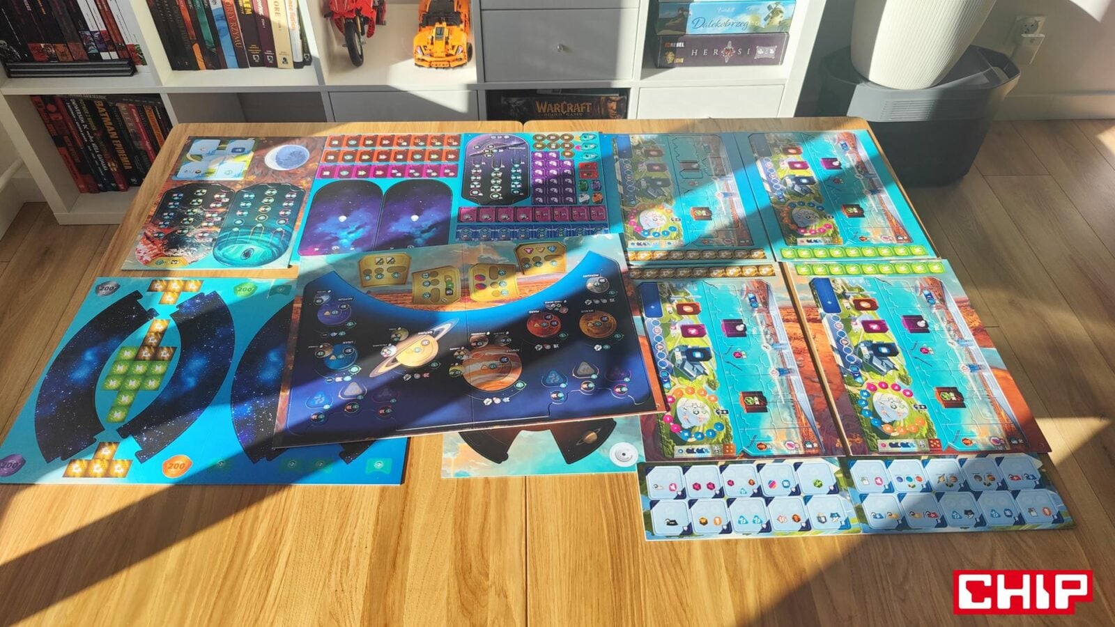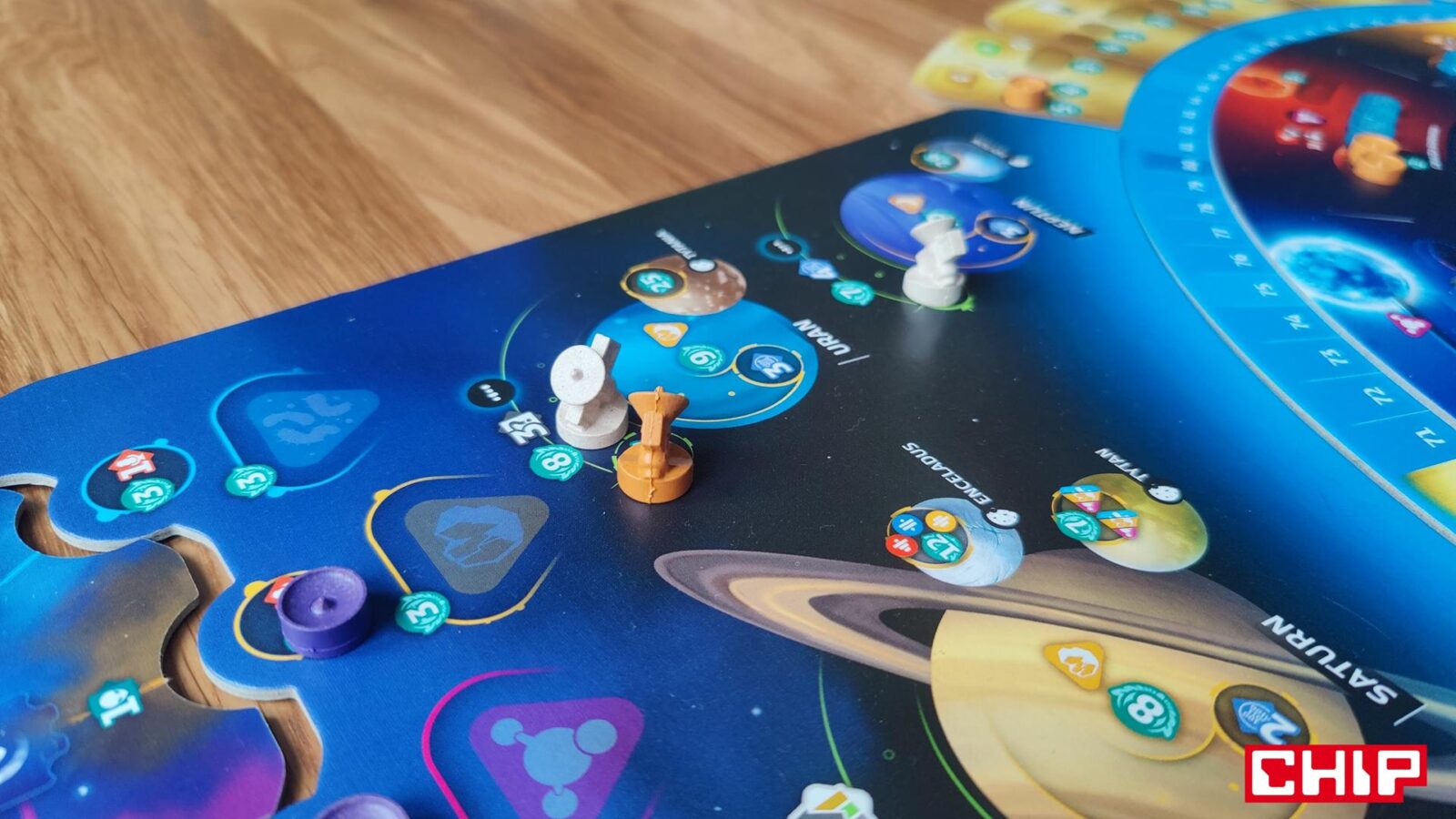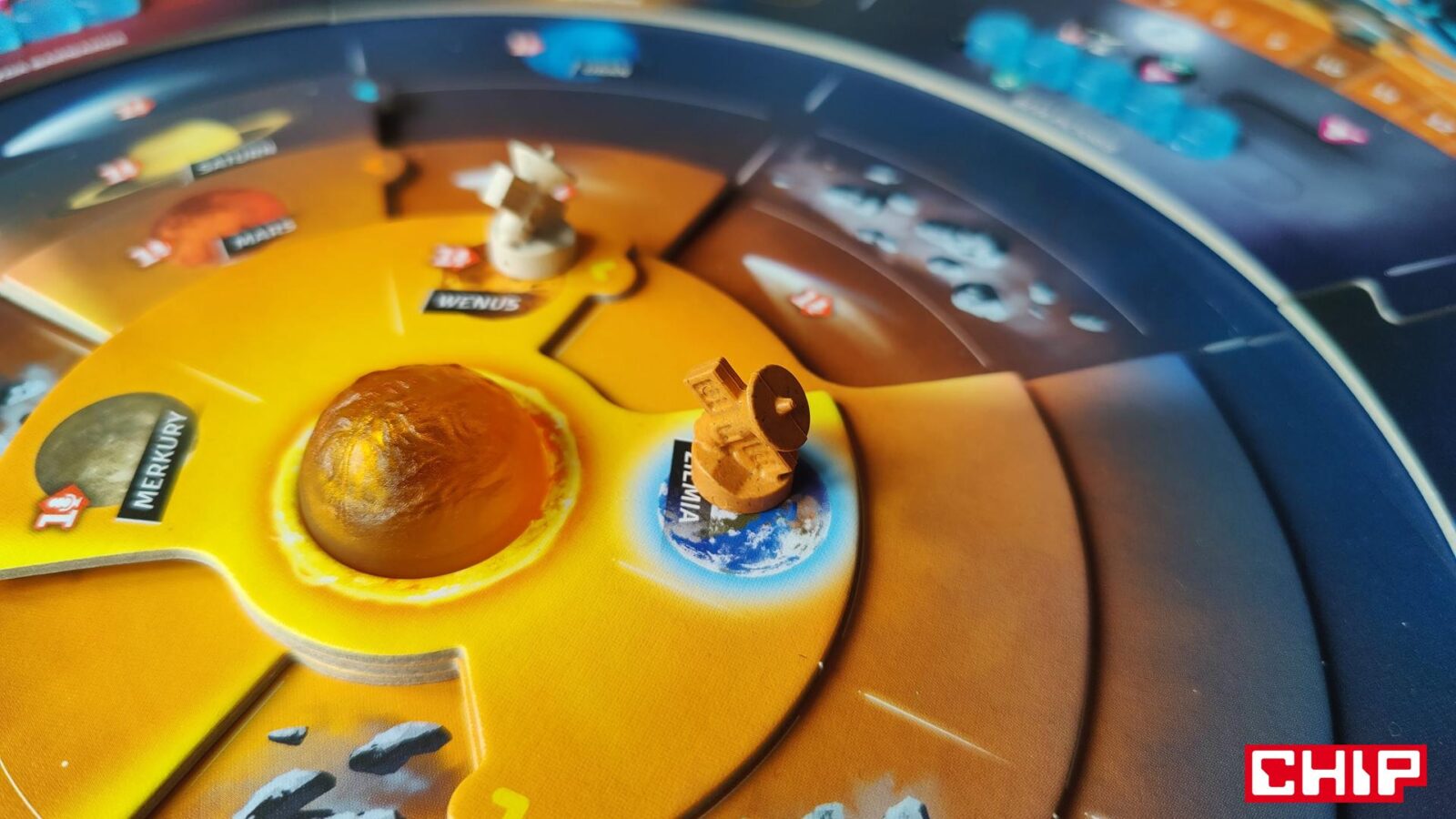 Jest więc tego sporo, ale mimo niskiej ceny gry planszowej, wykonanie poszczególnych elementów nie budzi żadnych wątpliwości. Dobrej jakości karty z ładnymi dla oka grafikami i nawet faktami z rzeczywistego świata napisanymi drobnym druczkiem, grube tekturowe elementy pozbawione odklejającego się laminatu, świetnej jakości plastikowe figurki oraz żetony, a do tego te trzy wielkie plansze główne, które pobudzają drzemiącą w nas ciekawość na temat świata tak bliskiego i tak odległego zarazem – naszego Układu Słonecznego. Czego z kolei brakuje? Ewidentnie wypraski, bo choć producent dorzucił całą masę foliowych woreczków, to te nie zastąpią dedykowanych slotów na poszczególne elementy.