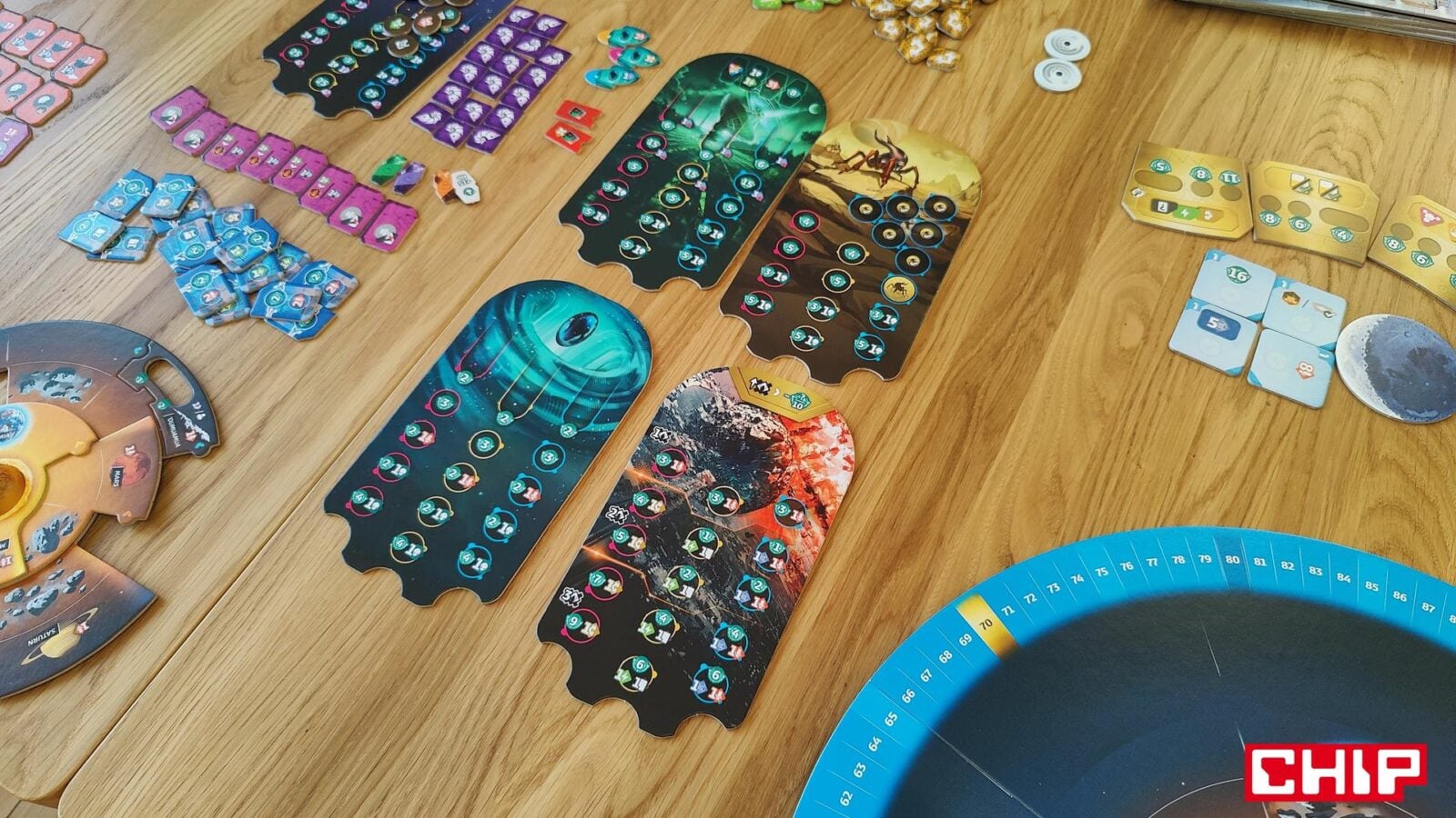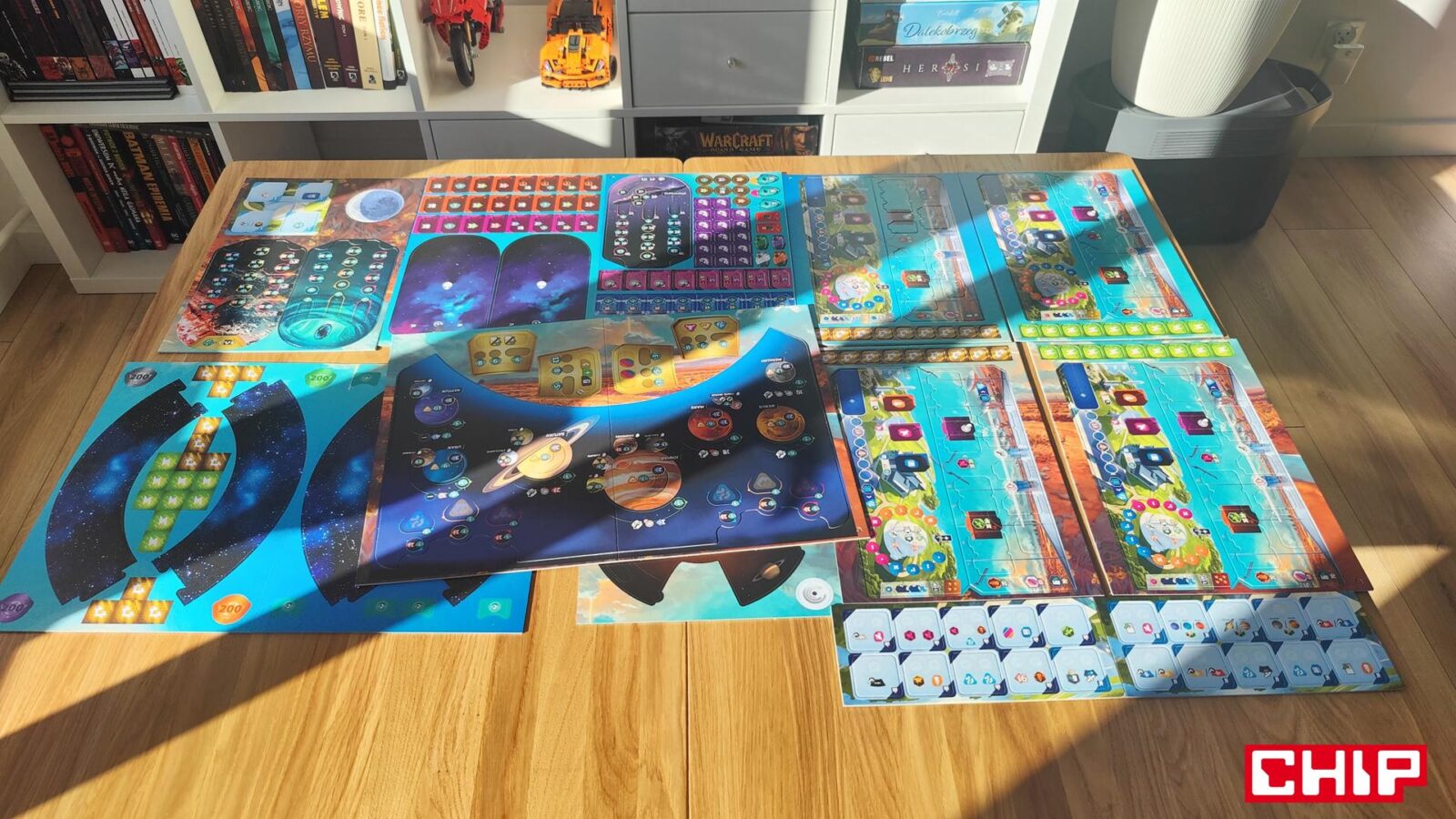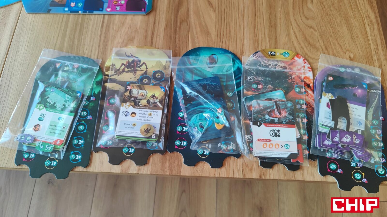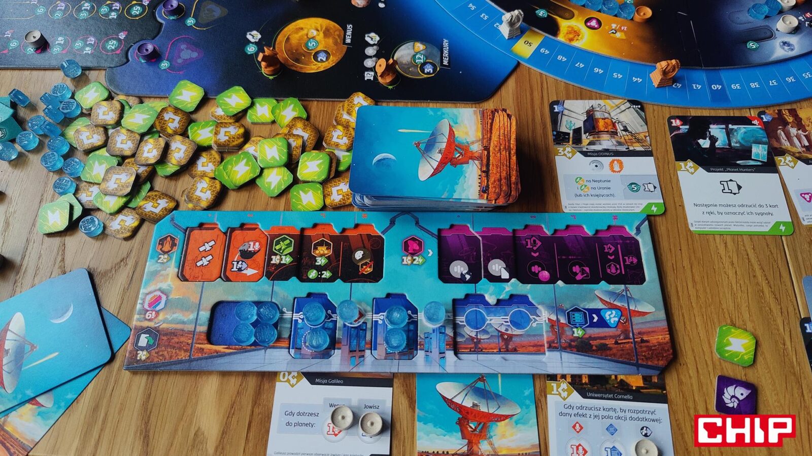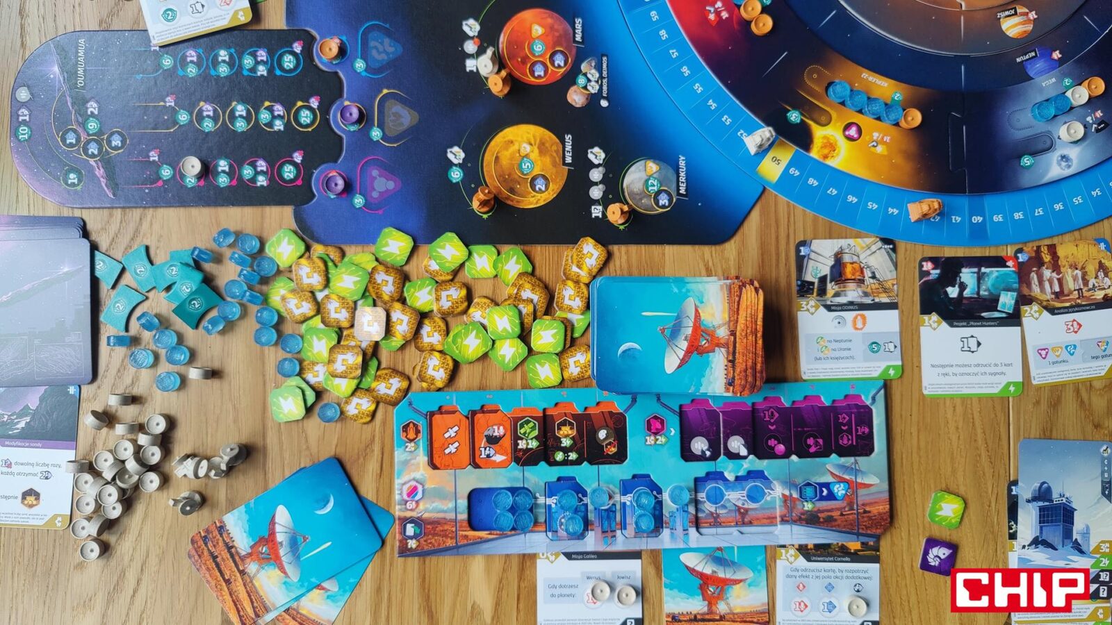 Jest więc tego sporo, ale mimo niskiej ceny gry planszowej, wykonanie poszczególnych elementów nie budzi żadnych wątpliwości. Dobrej jakości karty z ładnymi dla oka grafikami i nawet faktami z rzeczywistego świata napisanymi drobnym druczkiem, grube tekturowe elementy pozbawione odklejającego się laminatu, świetnej jakości plastikowe figurki oraz żetony, a do tego te trzy wielkie plansze główne, które pobudzają drzemiącą w nas ciekawość na temat świata tak bliskiego i tak odległego zarazem – naszego Układu Słonecznego. Czego z kolei brakuje? Ewidentnie wypraski, bo choć producent dorzucił całą masę foliowych woreczków, to te nie zastąpią dedykowanych slotów na poszczególne elementy.