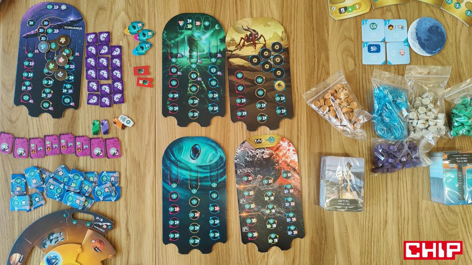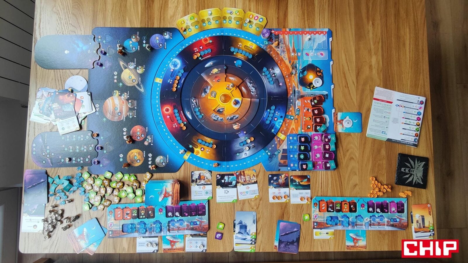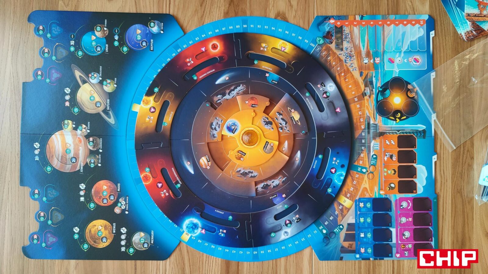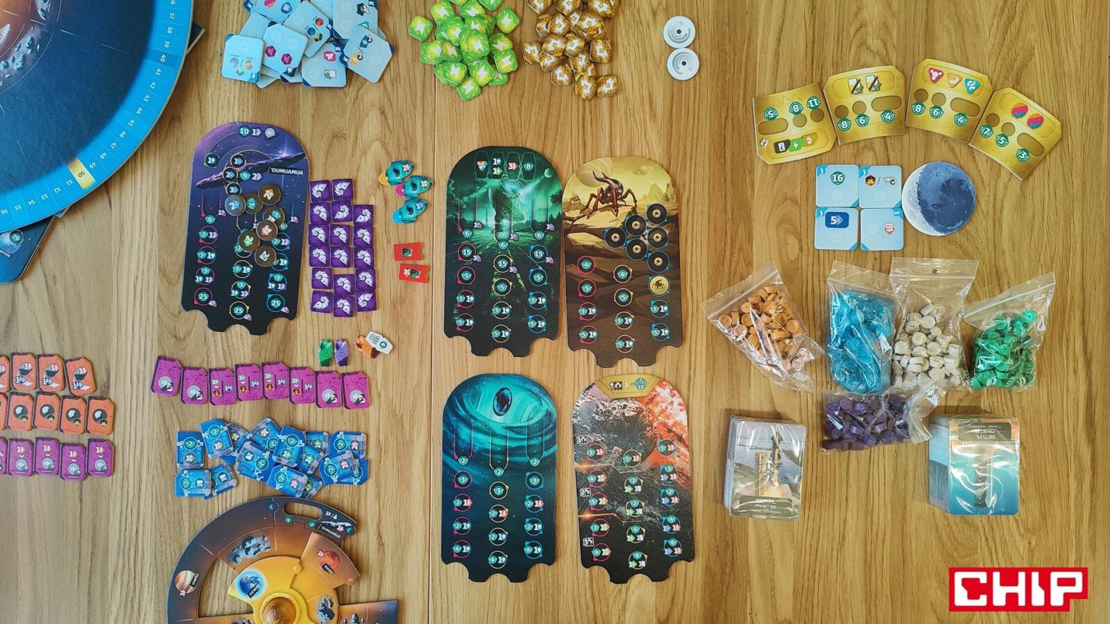 Jest więc tego sporo, ale mimo niskiej ceny gry planszowej, wykonanie poszczególnych elementów nie budzi żadnych wątpliwości. Dobrej jakości karty z ładnymi dla oka grafikami i nawet faktami z rzeczywistego świata napisanymi drobnym druczkiem, grube tekturowe elementy pozbawione odklejającego się laminatu, świetnej jakości plastikowe figurki oraz żetony, a do tego te trzy wielkie plansze główne, które pobudzają drzemiącą w nas ciekawość na temat świata tak bliskiego i tak odległego zarazem – naszego Układu Słonecznego. Czego z kolei brakuje? Ewidentnie wypraski, bo choć producent dorzucił całą masę foliowych woreczków, to te nie zastąpią dedykowanych slotów na poszczególne elementy.