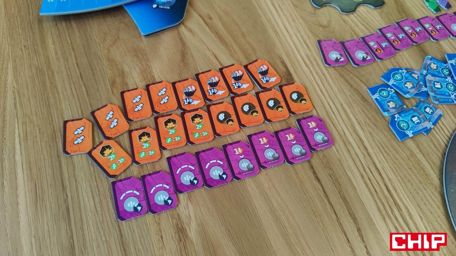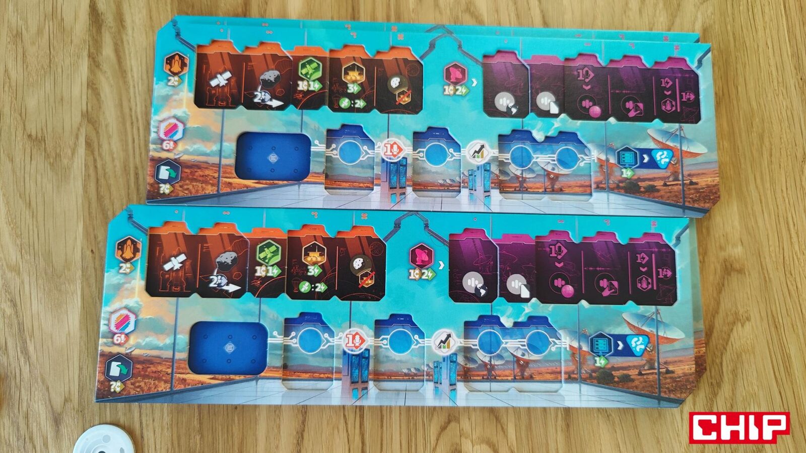 Resztę elementów dobieramy wedle zaleceń i bardzo szybko nasz stolik wypełni się jeśli nie planszą i zasobami, to również komponentami graczy, którzy mają dostęp do swoich zasobów i plansz prezentujących m.in. poziom ich technologicznego zaawansowania, do których z czasem dojdzie też zestaw kart misji. Gra polega bowiem nie tylko na eksplorowaniu kosmosu z wykorzystaniem sond, orbiterów i łazików, ale też jego badania i to w najbardziej strategiczny sposób, abyśmy nie tylko mieli co kolejną rundę (jest ich pięć) więcej zasobów, ale też możliwości.