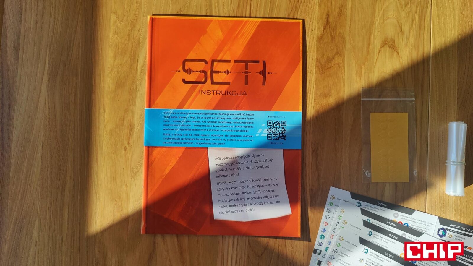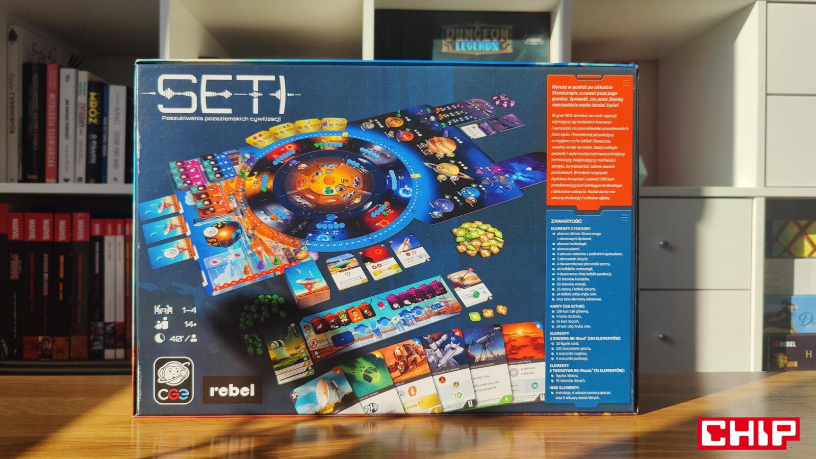 Cały 3,35-kg zestaw SETI obejmuje całą masę elementów, wśród których znajduje się plansza Układu Słonecznego z obrotowymi dyskami, plansza technologii, plansza planet, 4 plansze sektorów z pobliskimi gwiazdami, 5 planszetek obcych, 4 dwuwarstwowe planszetki graczy, 48 kafelków technologii, 4 dwustronne złote kafelki punktacji, 30 żetonów kredytów, 30 żetonów energii, 33 żetony i kafelki obcych, 24 kafelki celów trybu solo, 138 kart talii głównej opatrzonych świetną grafiką i zastrzykiem rzeczywistych informacji, 4 karty dochodu, 55 kart obcych, 19 kart akcji trybu solo, 32 figurki sond, 120 znaczników graczy, 4 znaczniki rozgłosu, 4 znaczniki punktacji, 70 żetonów danych, instrukcja, arkusze pomocy gracza, 5 arkuszy zasad obcych czy znajdująca się w centrum planszy Układu Słonecznego figurka plastikowego Słońca, ale niestety bez diody.